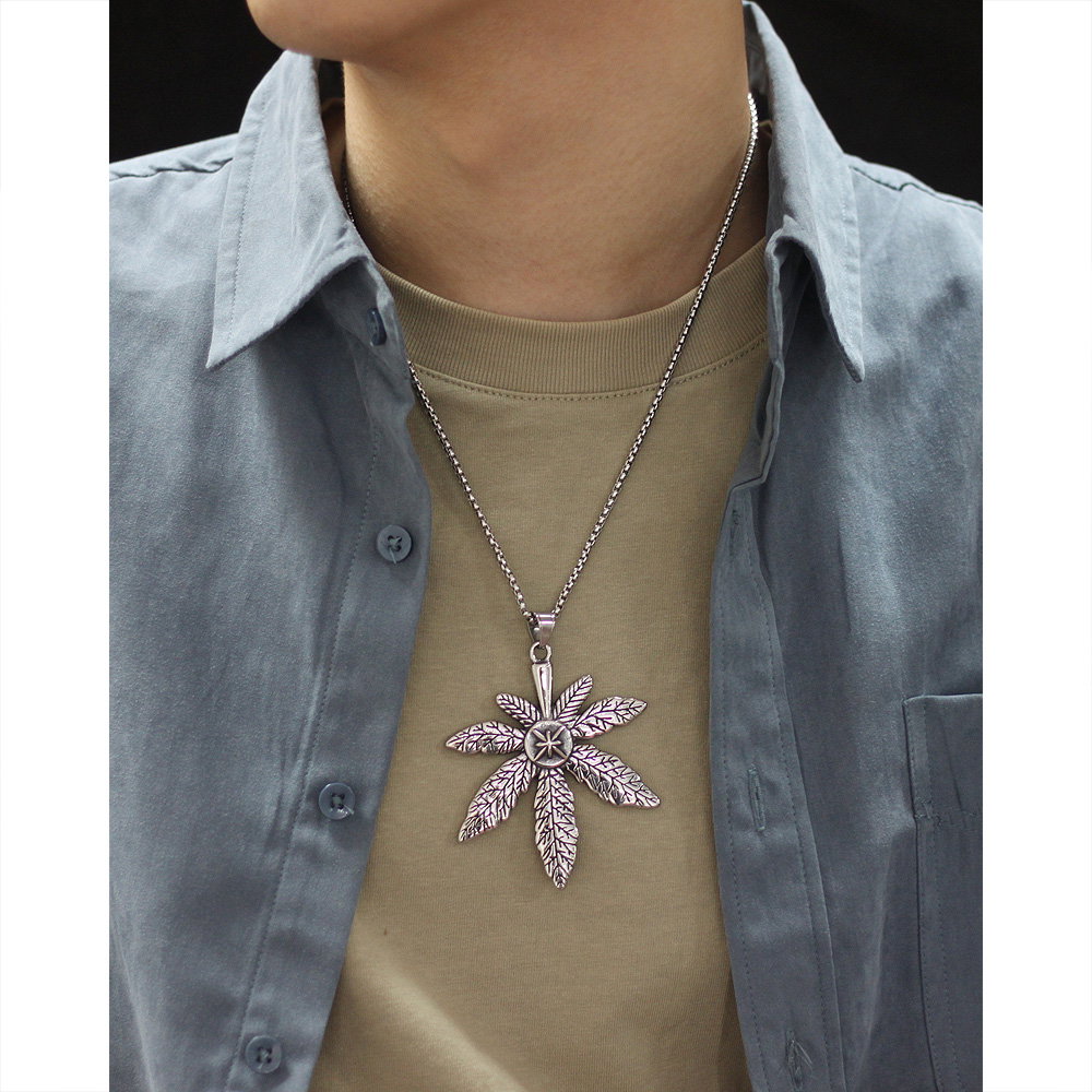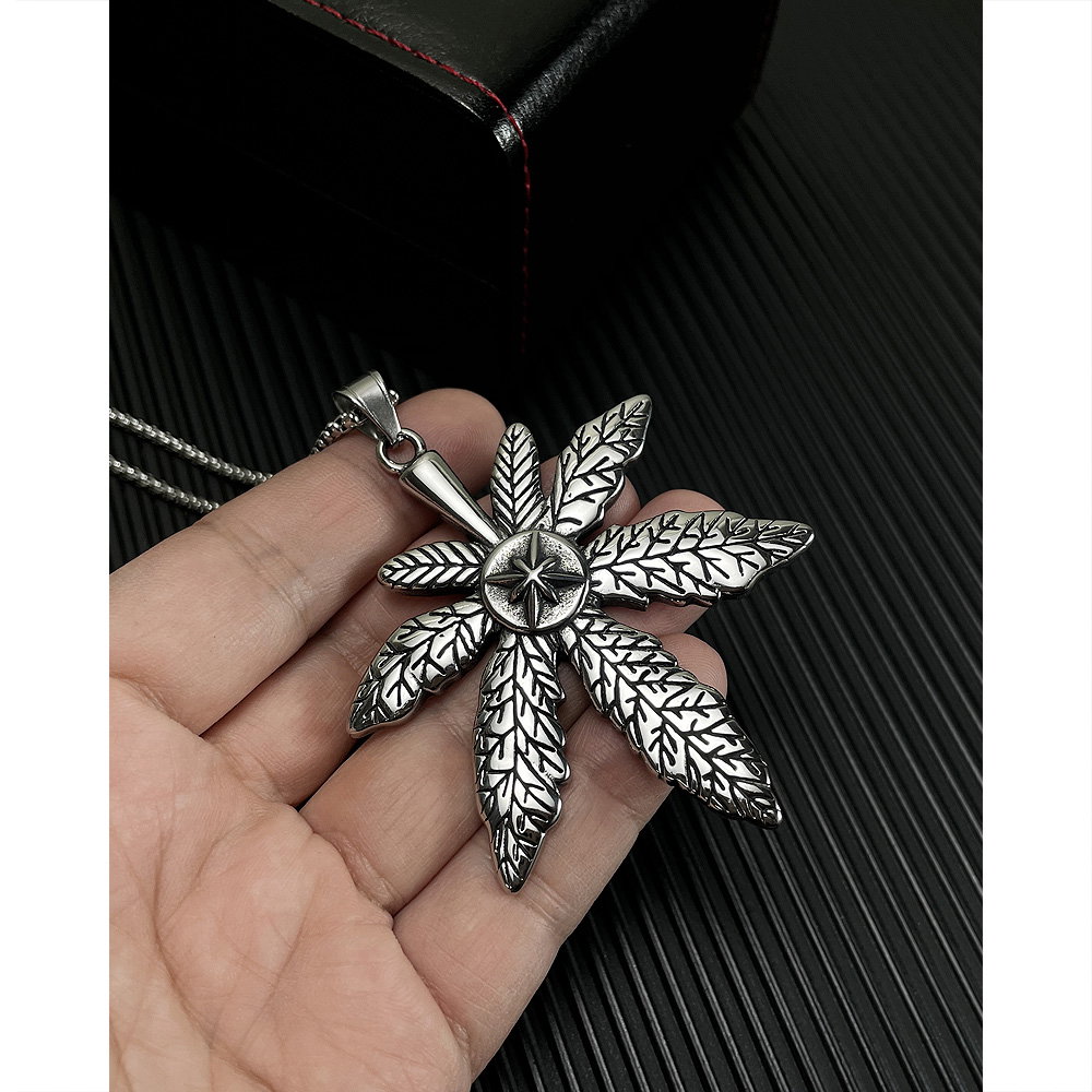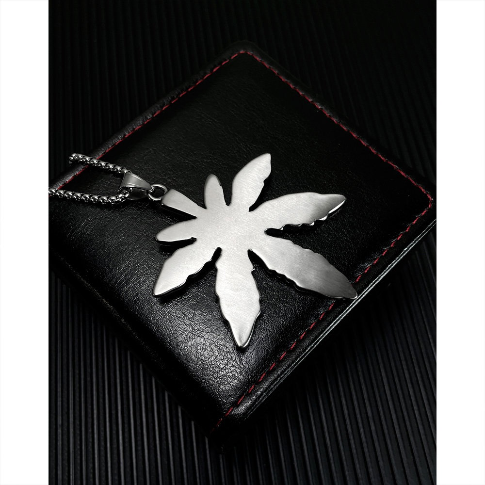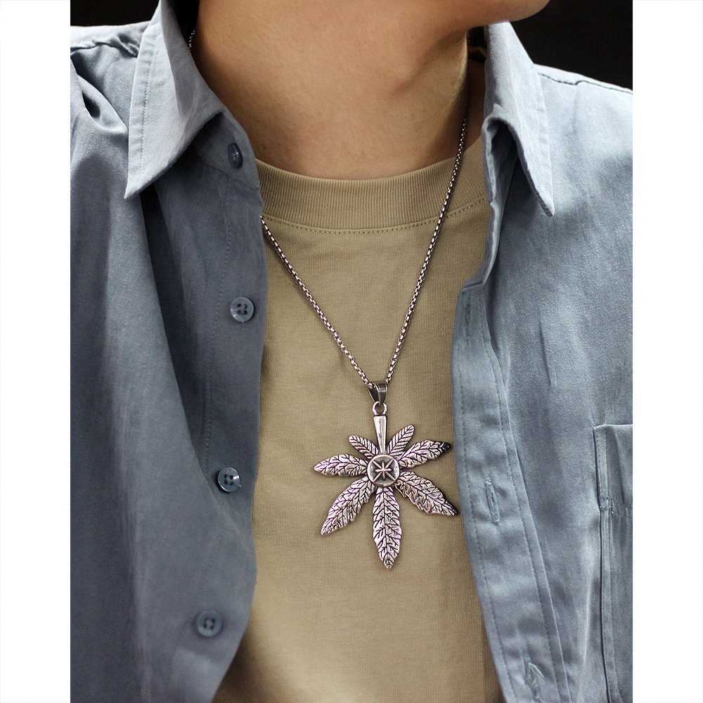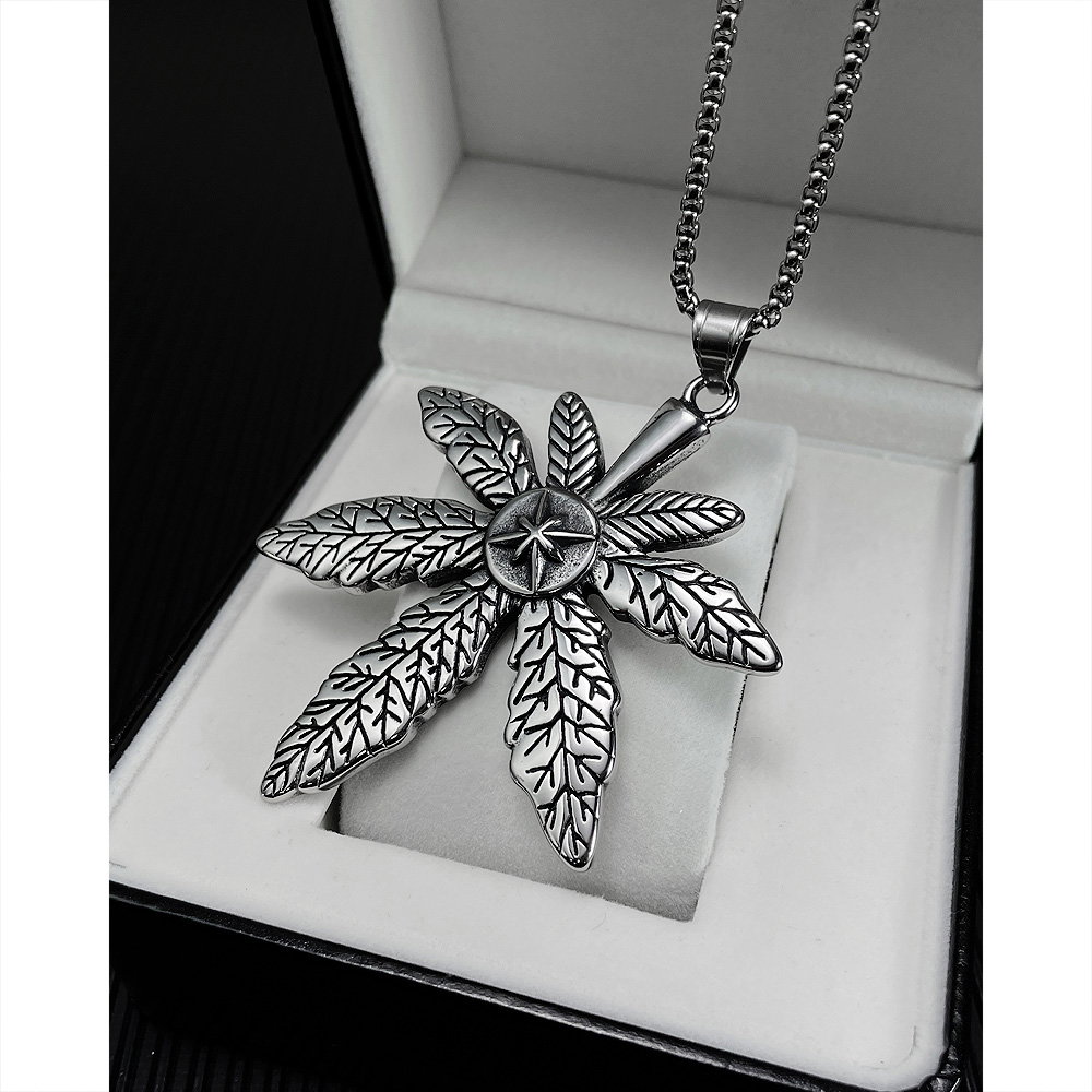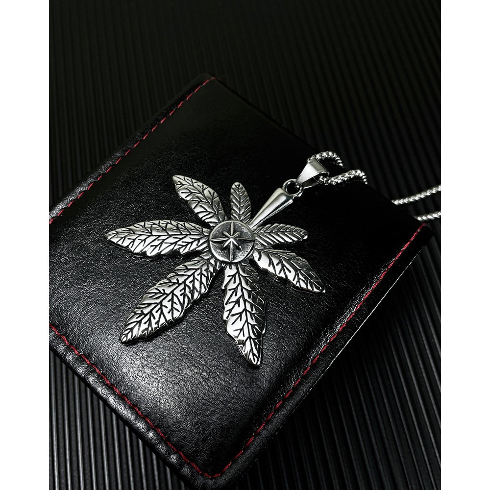 Colier inox frunza de canabis. Dimensiuni lant: Lungime 70 cm, Grosime 4 mm. Culoare: Argintiu. Dimensiuni pandantiv: vezi schita in poze produs.
