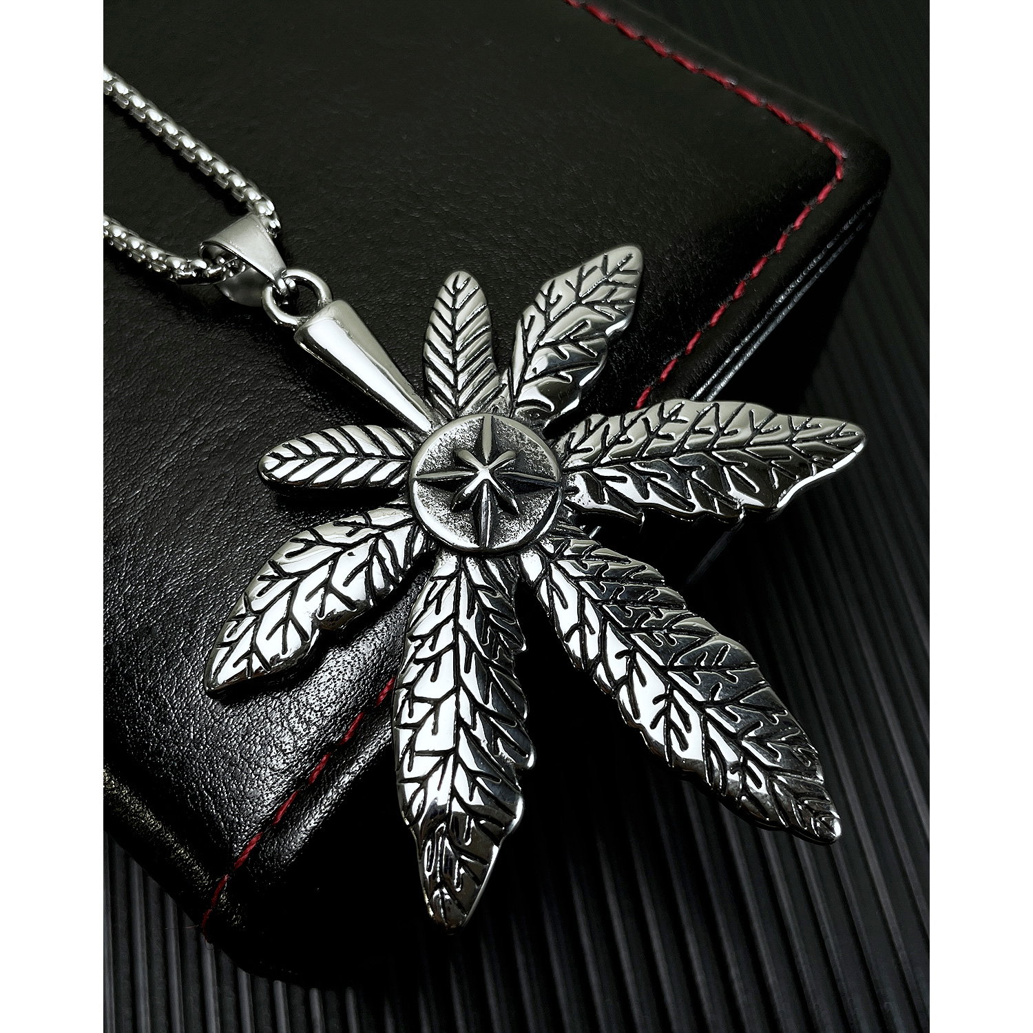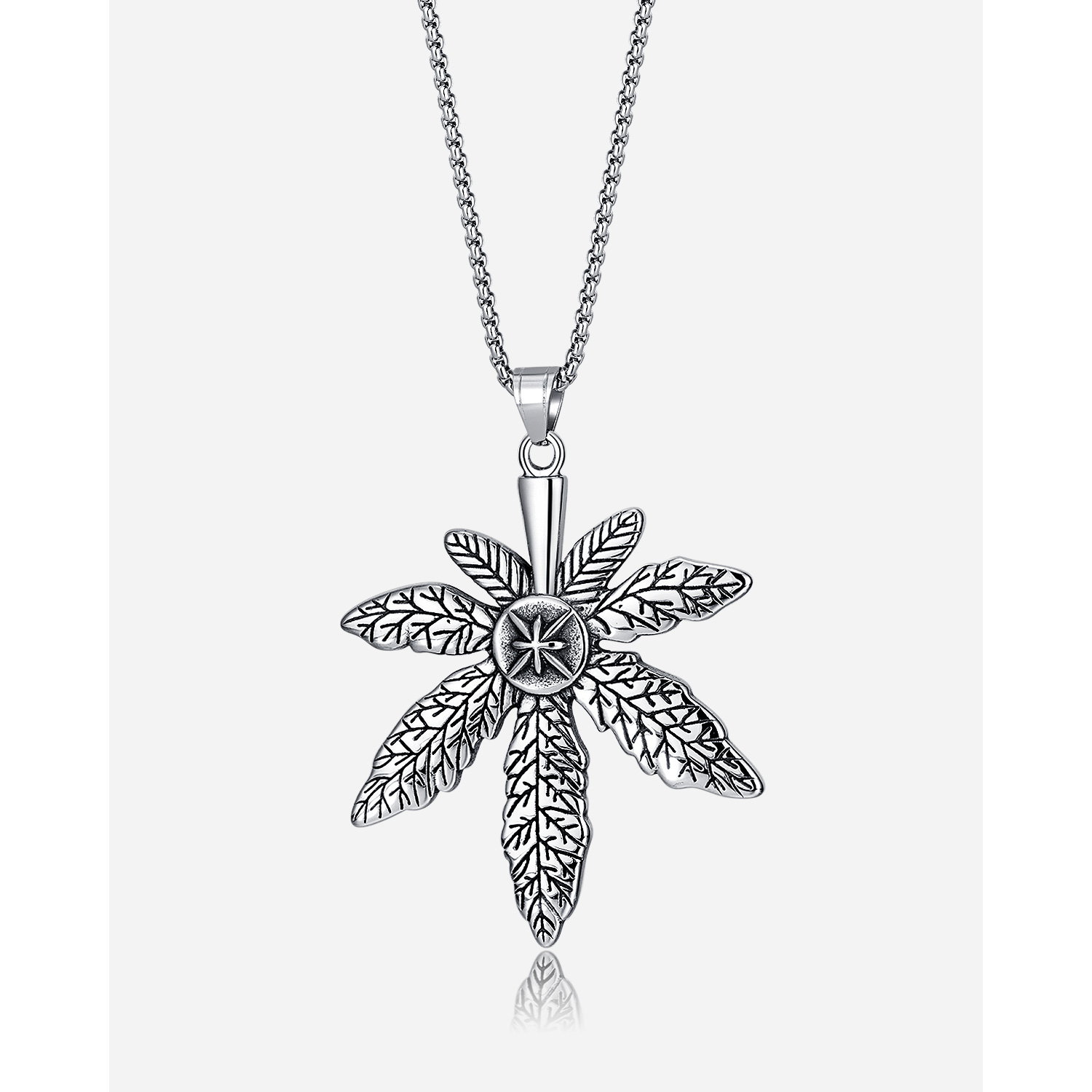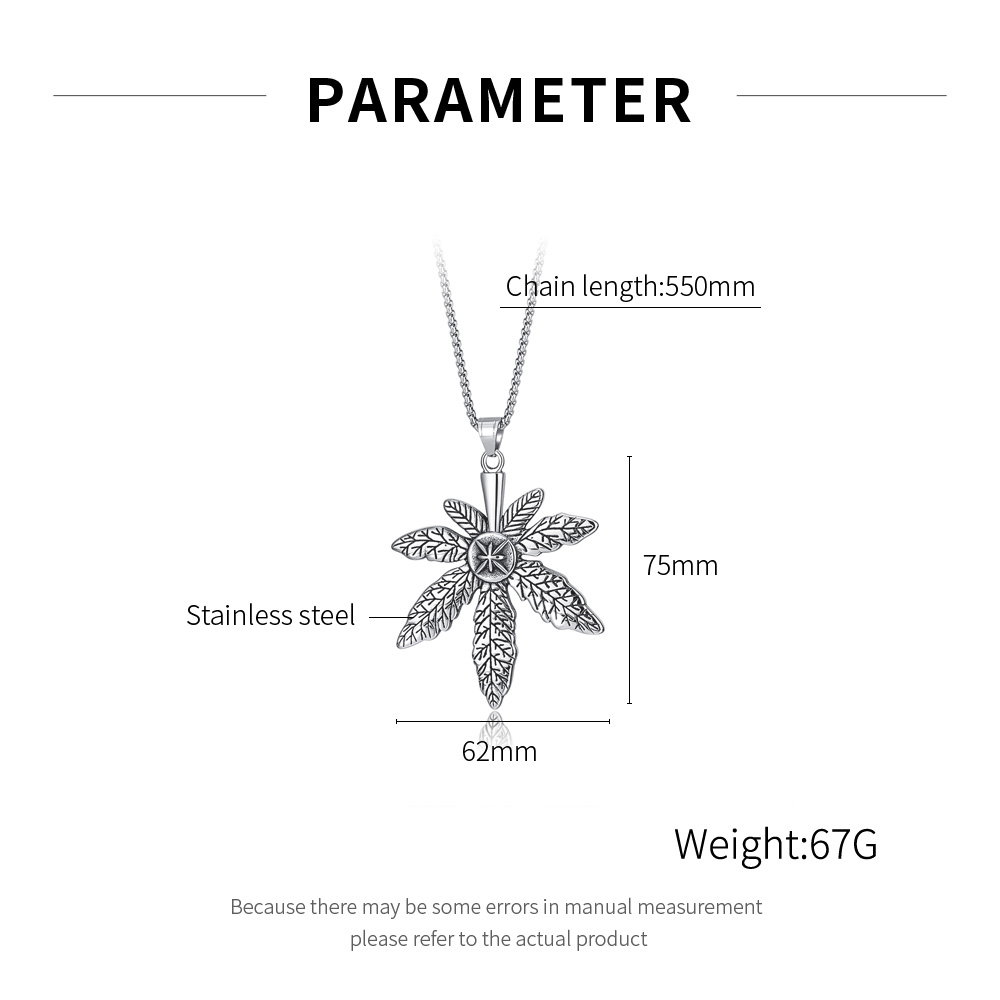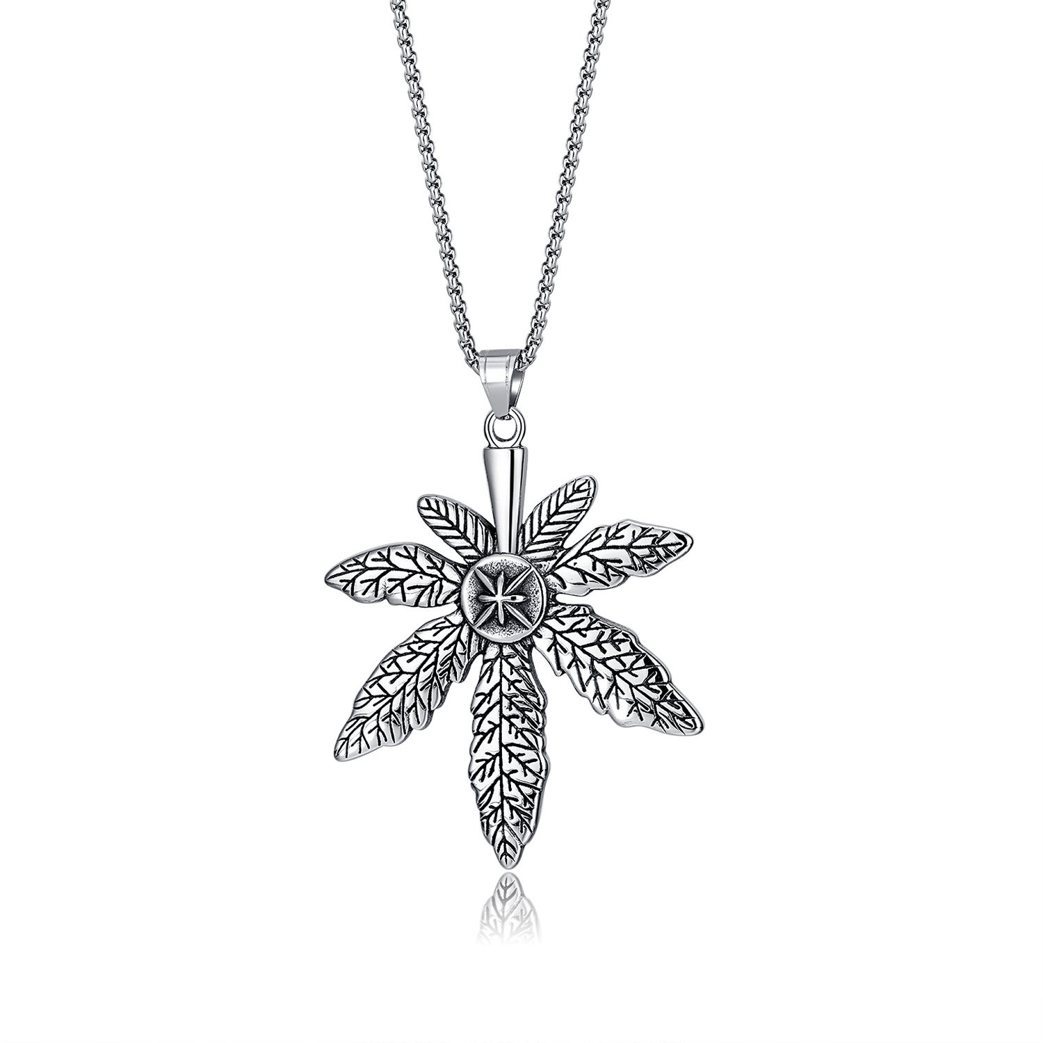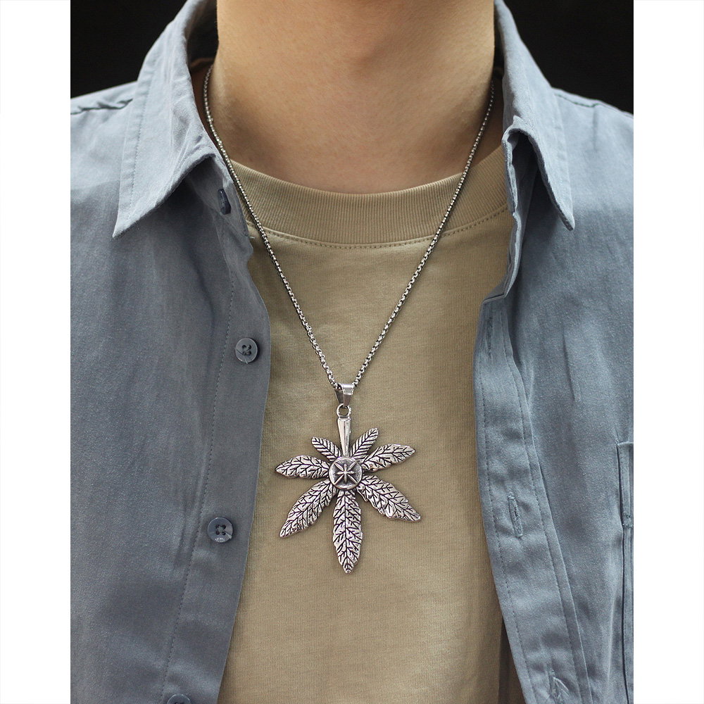 Colier inox frunza de canabis. Dimensiuni lant: Lungime 70 cm, Grosime 4 mm. Culoare: Argintiu. Dimensiuni pandantiv: vezi schita in poze produs.