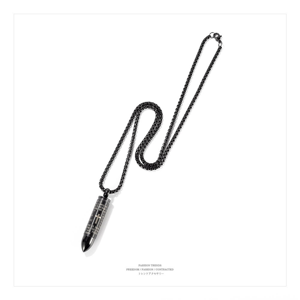 Colier inox glont cu rugaciune. Dimensiuni lant: Lungime 55 cm, Grosime 3 mm. Culoare: Negru. Dimensiuni pandantiv: vezi schita in poze produs.