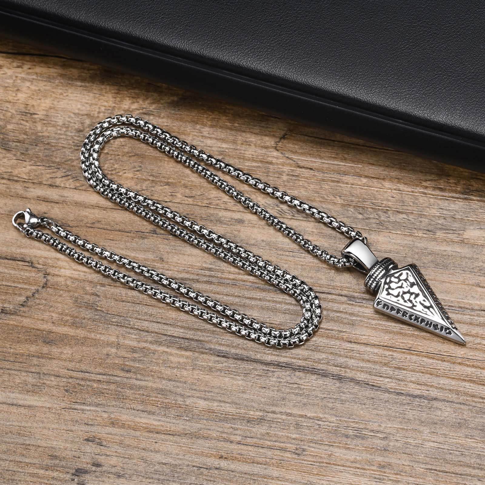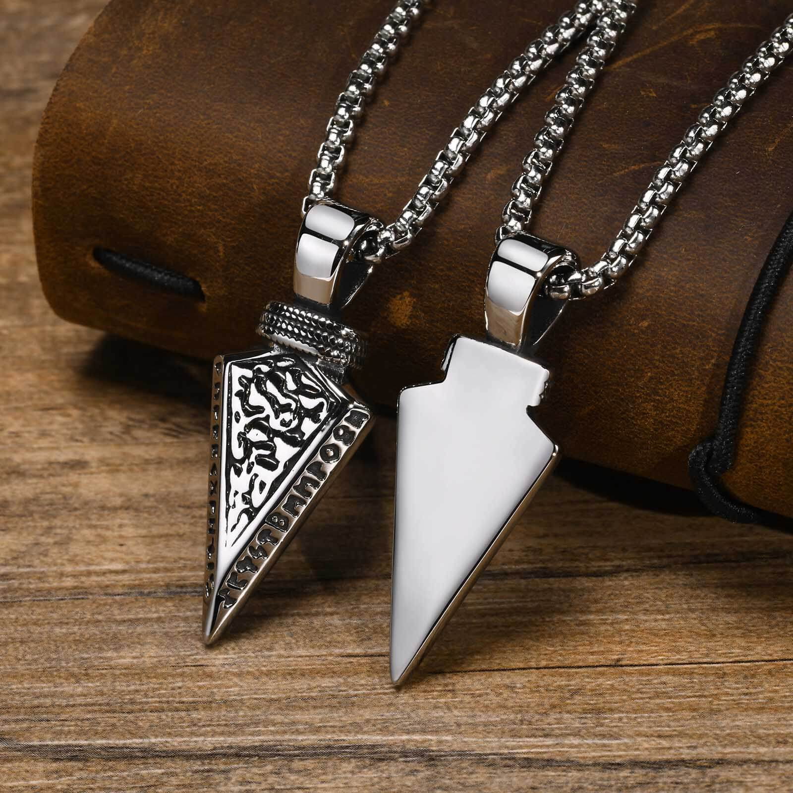 Colier inox sageata Viking 60 cm. Dimensiuni: Lant 60 cm, Pandantiv 45 mm x 18 mm. Culoare: Argintiu. Material: Inox.