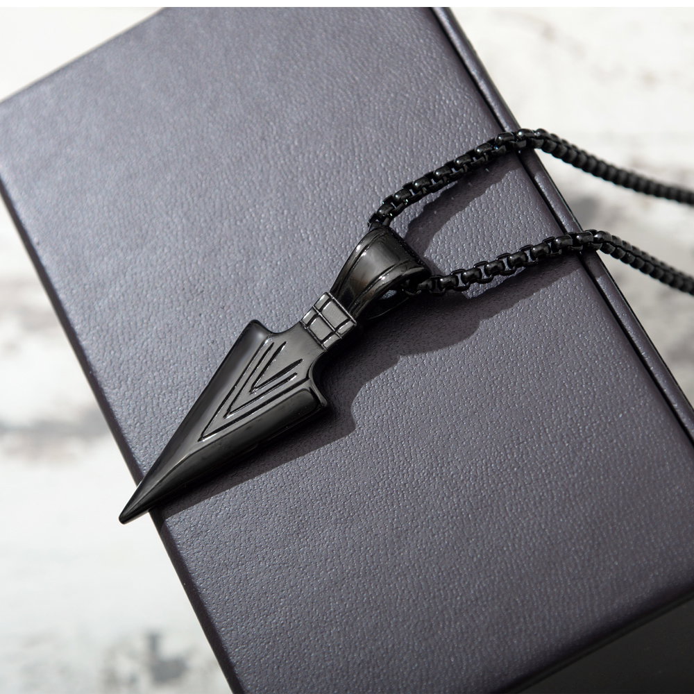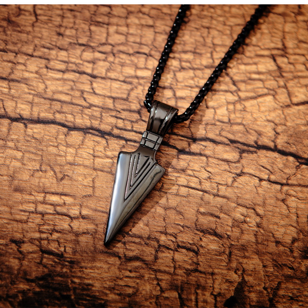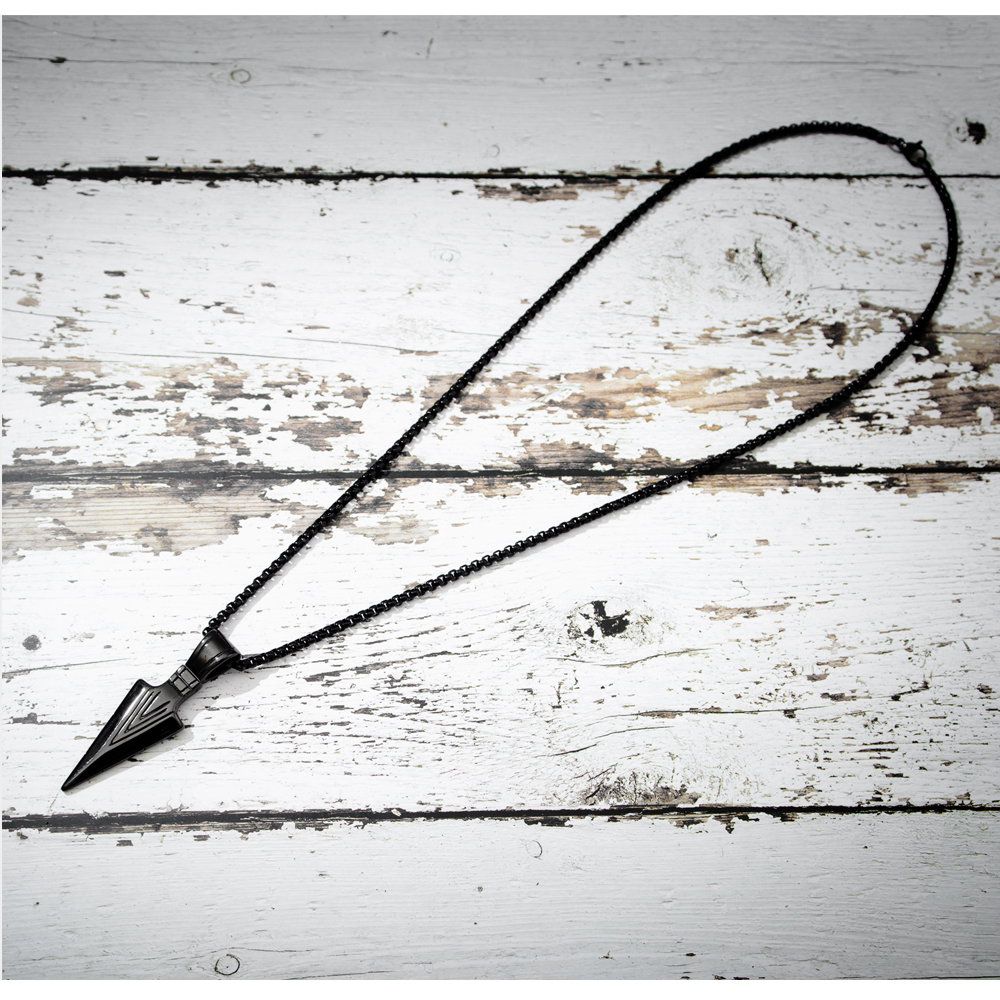 Colier inox varf de sageata. Dimensiuni lant: Lungime 55 cm, Grosime 3 mm. Culoare: Negru. Dimensiuni pandantiv: vezi schita in poze produs.