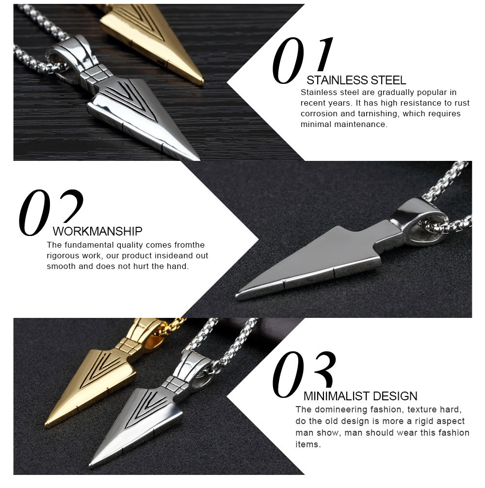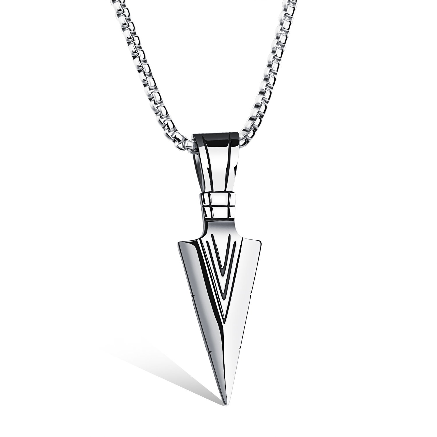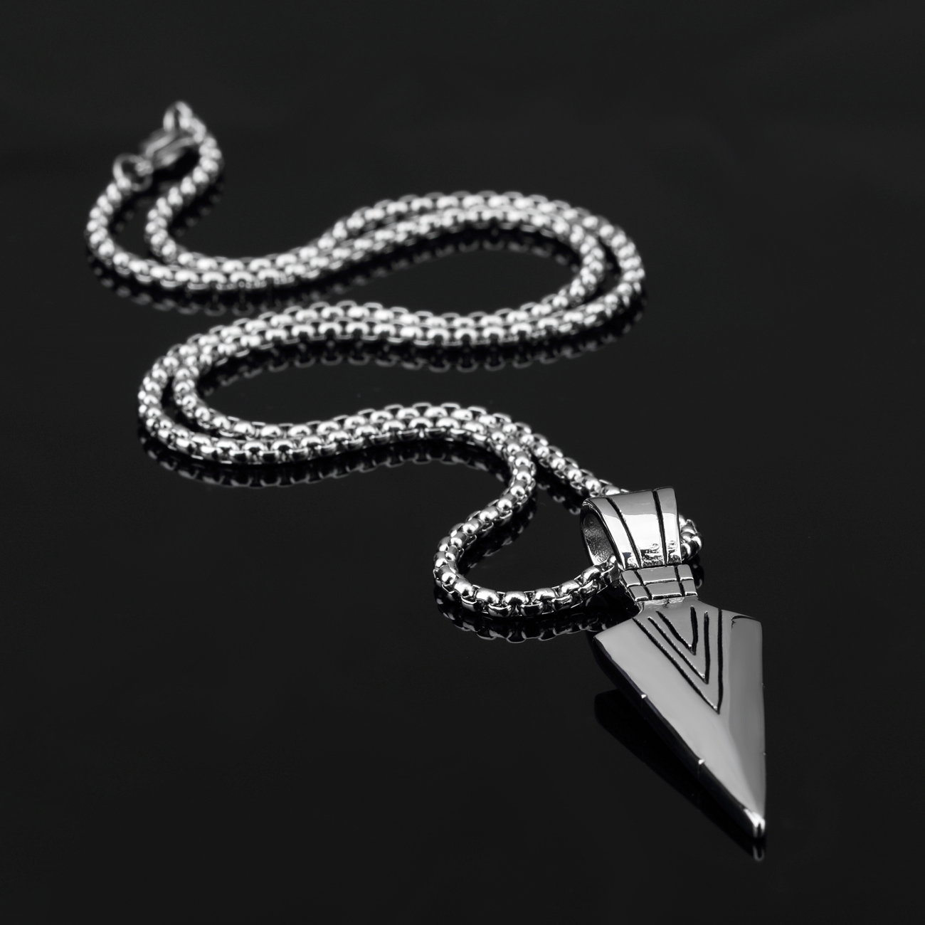 Colier inox varf de sageata. Dimensiuni lant: Lungime 55 cm, Grosime 3 mm. Culoare: Argintiu. Dimensiuni pandantiv: vezi schita in poze produs.