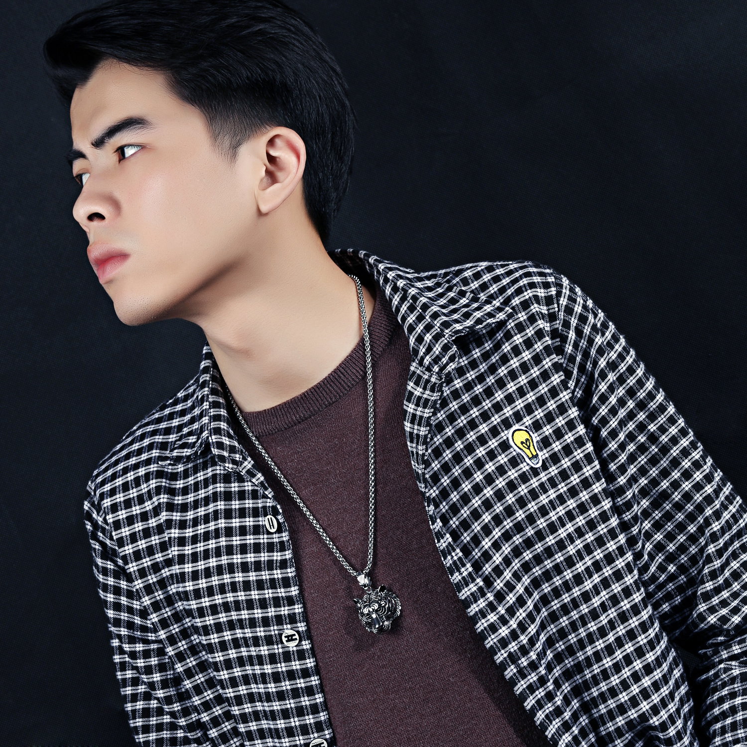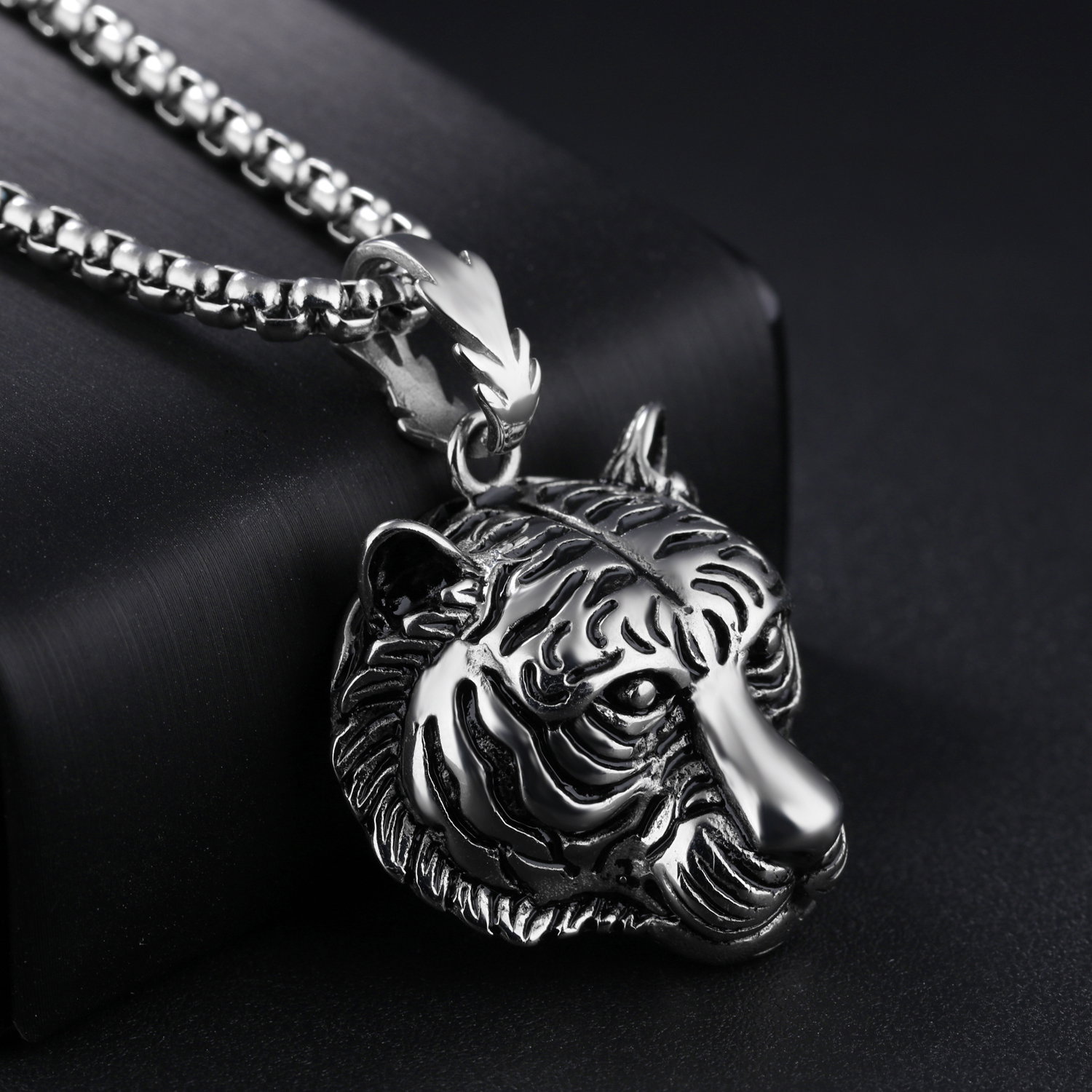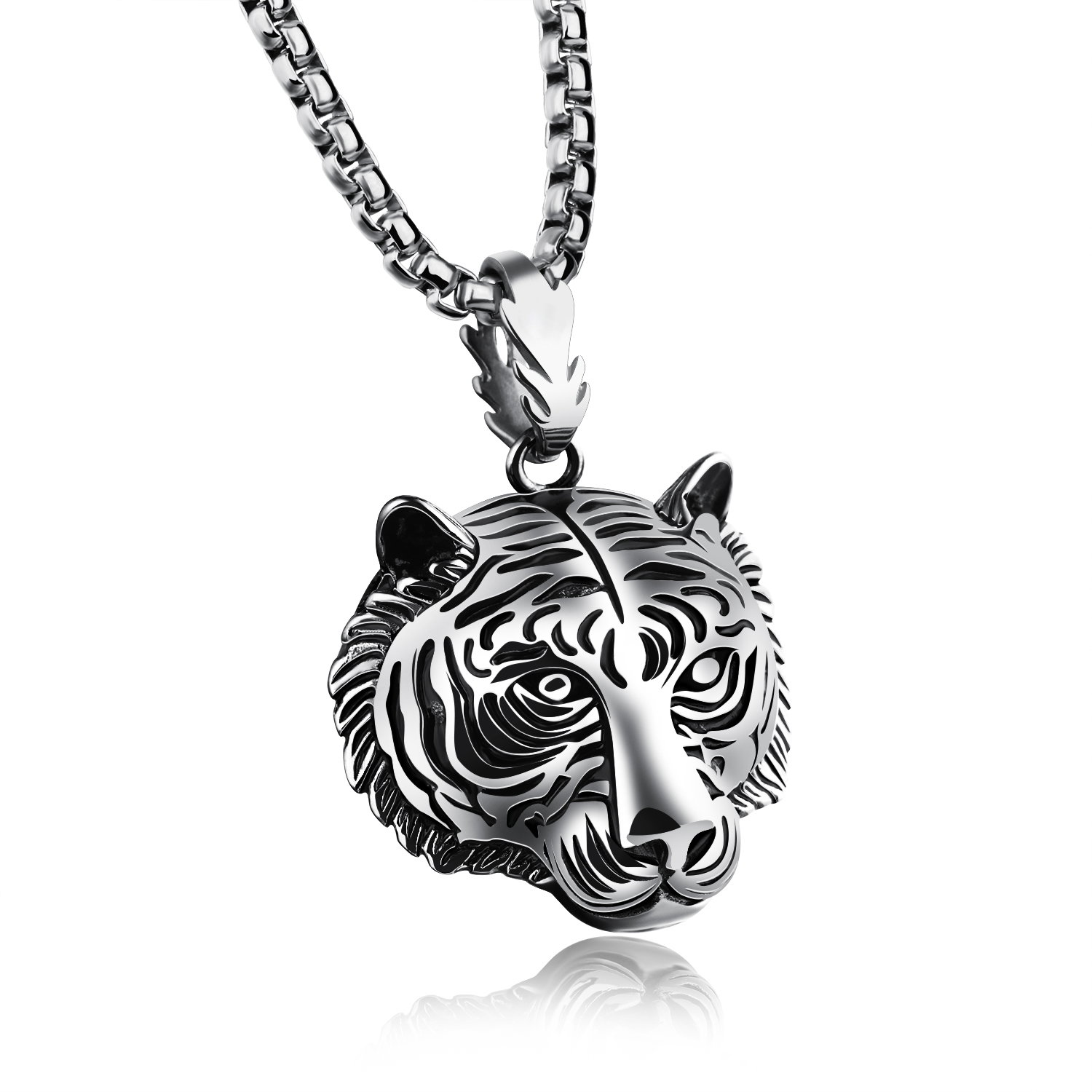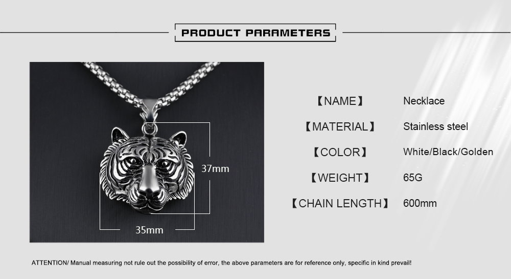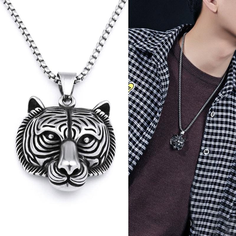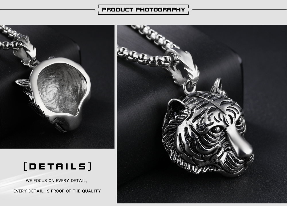 Colier inox cu cap de tigru. Dimensiuni Pandant (fara anou): 3,7 x 3,5 cm, Lungime Lant: 60 cm, Grosime lant 4 mm.