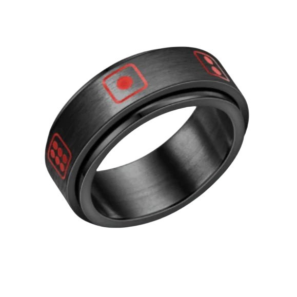 Inel antistres din otel inoxidabil, negru, cu zaruri. Partea exterioara a inelului se invarte peste suprafata inelului interior. Latime: 8 mm.