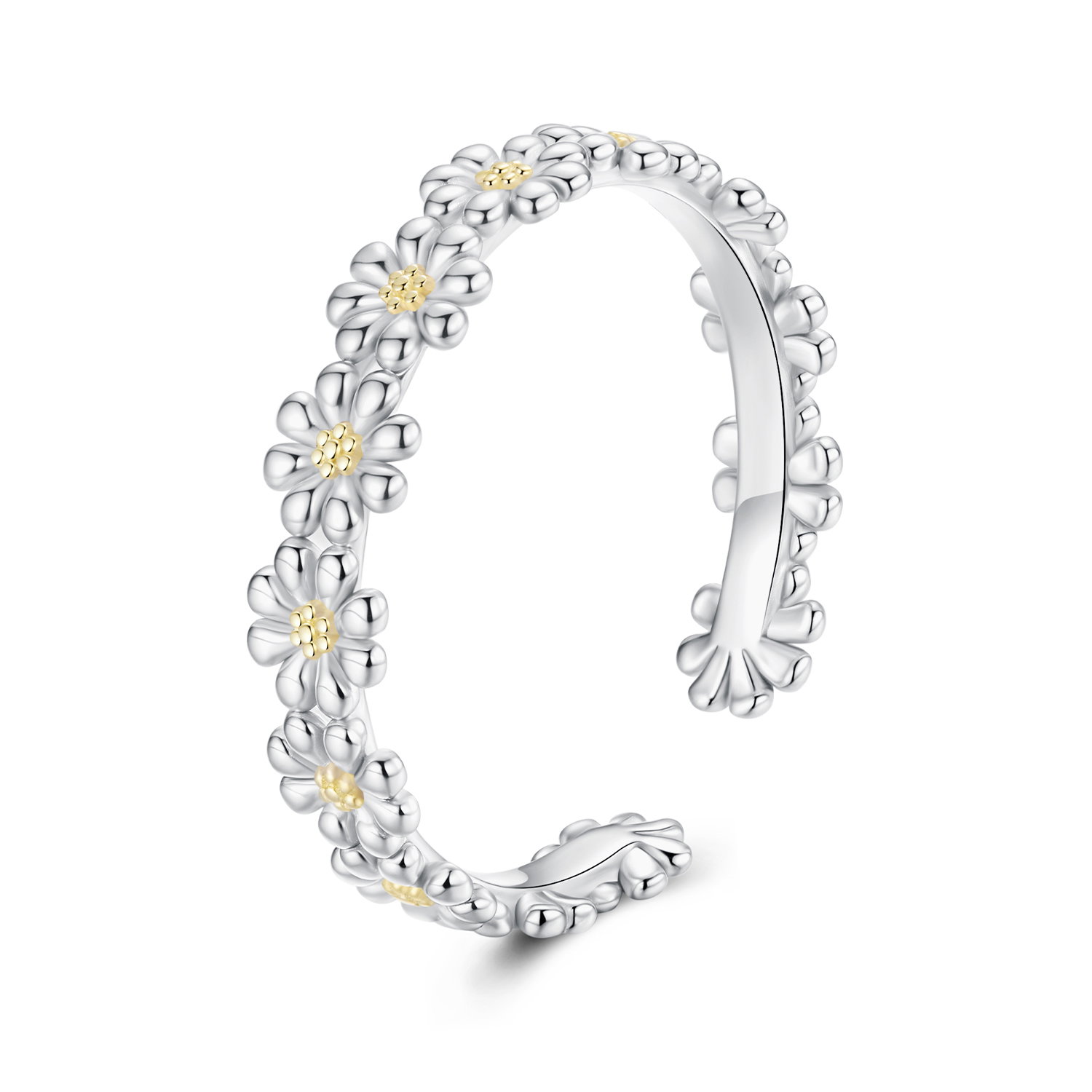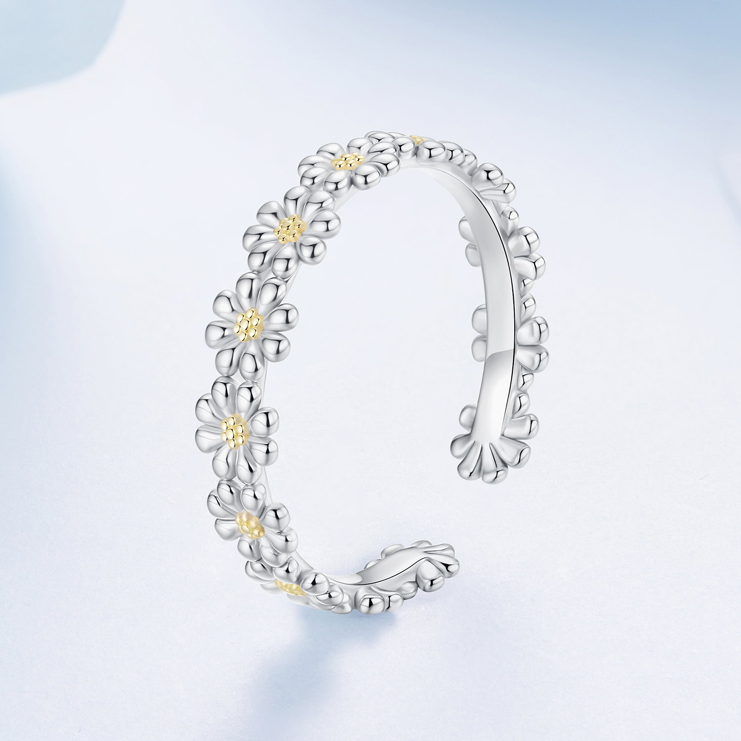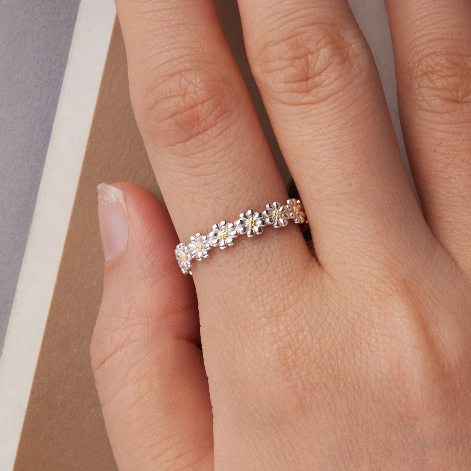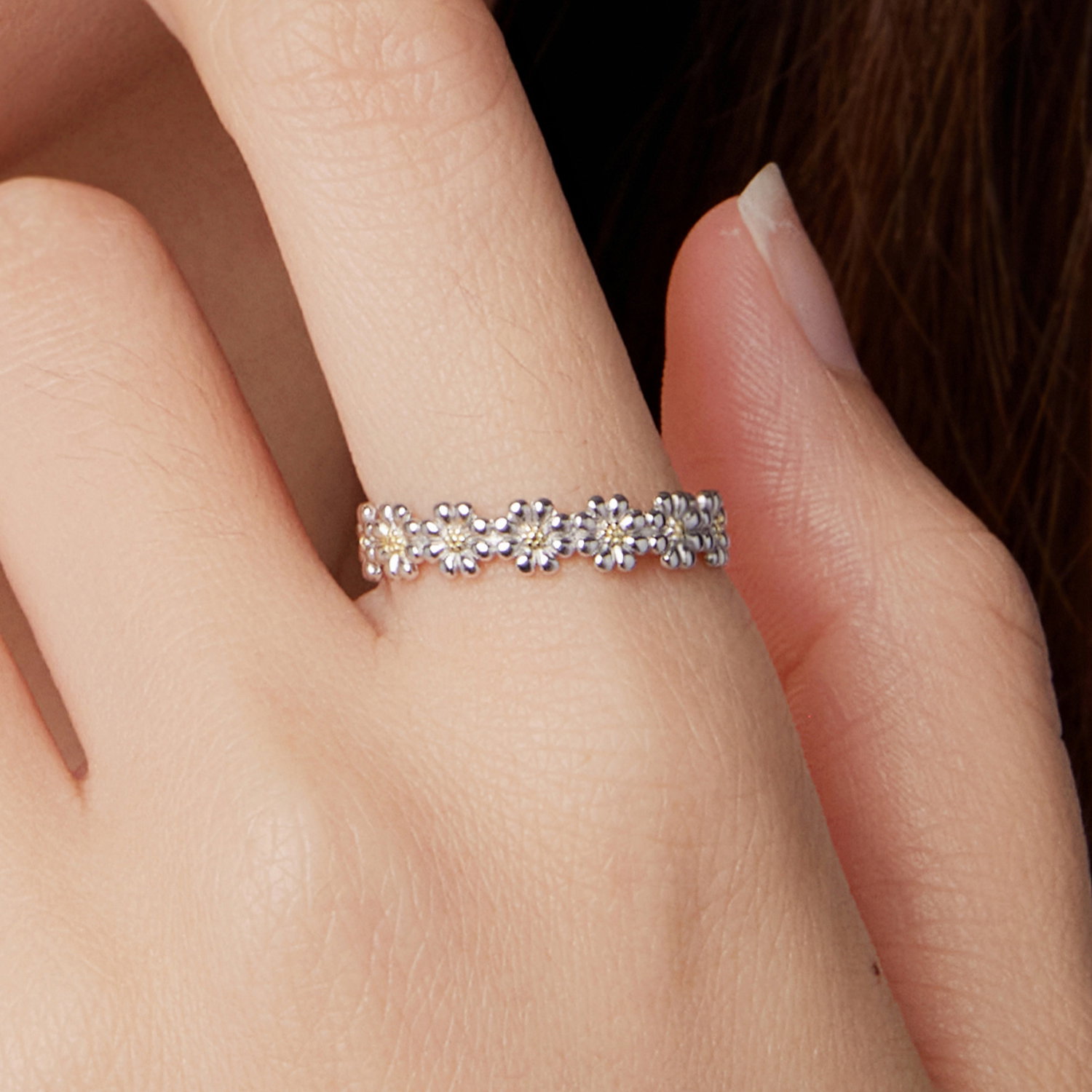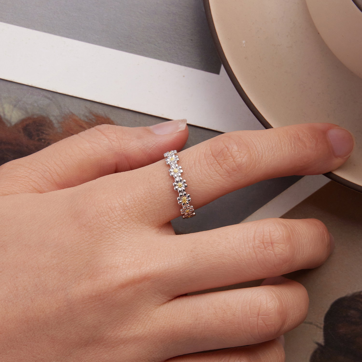 Tema margaretei da acestei bijuterii un aer feminin si luminos, usor de remarcat din prima privire. Deschiderea fina echilibreaza bine compozitia si lasa tema bijuteriei sa se vada clar. Realizat din Argint 925 placat cu rodiu si cu aur, inelul pastreaza un aspect bine echilibrat. Merge foarte bine in combinatii cu alte bijuterii, dar ramane suficient de expresiv si purtat singur. Tocmai acest echilibru intre forma, material si detaliu il face usor de placut si de purtat.