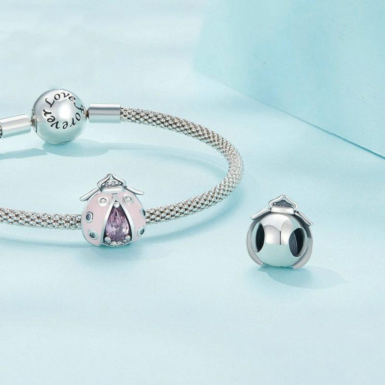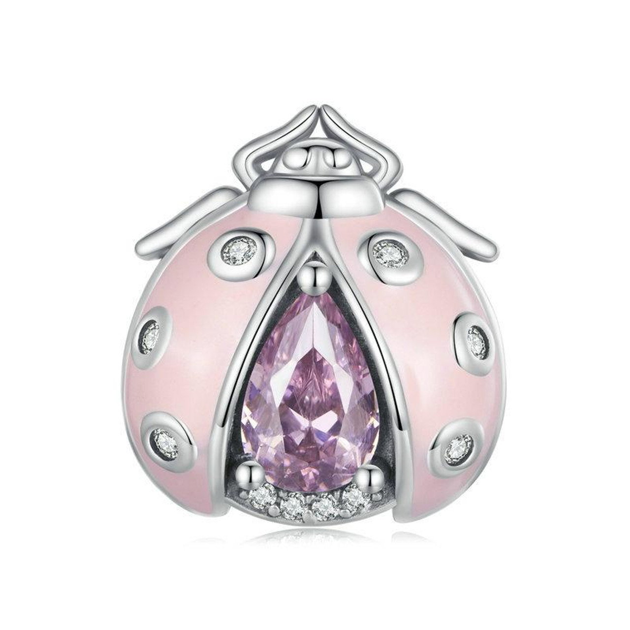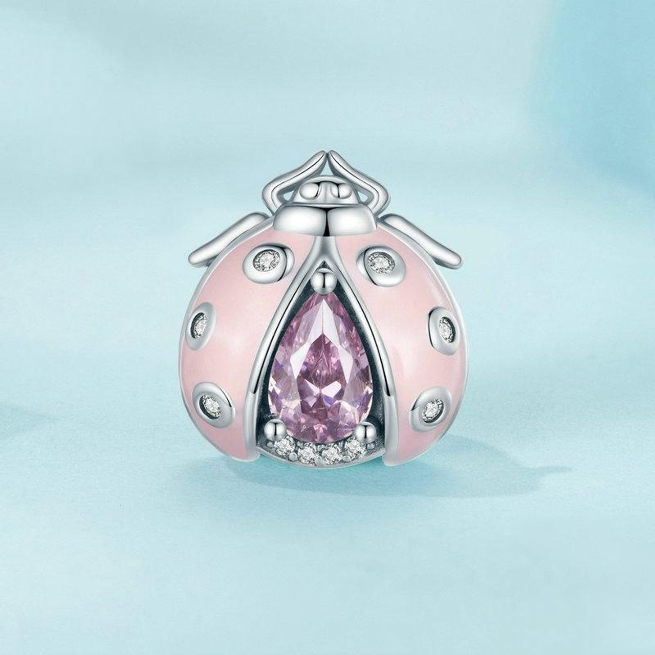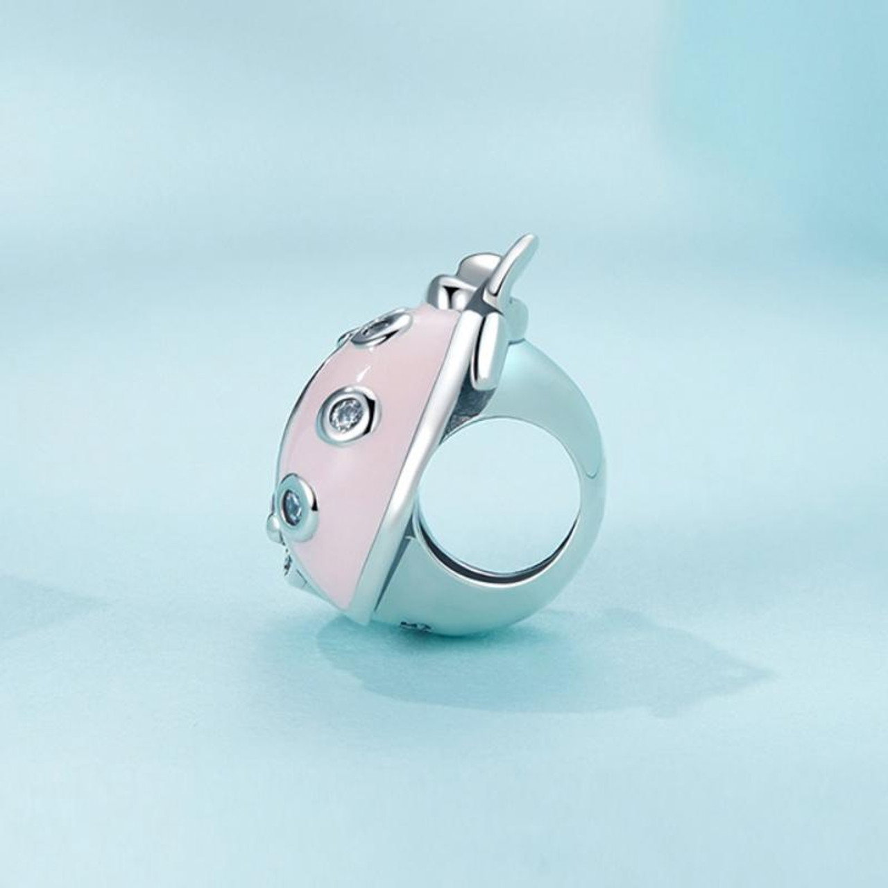 Pandantiv argint buburuza cu sapte stele. Dimensiuni: 1,3 x 1,1 cm,Diametru gaura 0,5 cm. Material: Argint 925, Email, Zirconiu. Culoare: Roz. Pietre: Zirconiu. Ambalaj: Cutiuta bijuterii (gratuit).