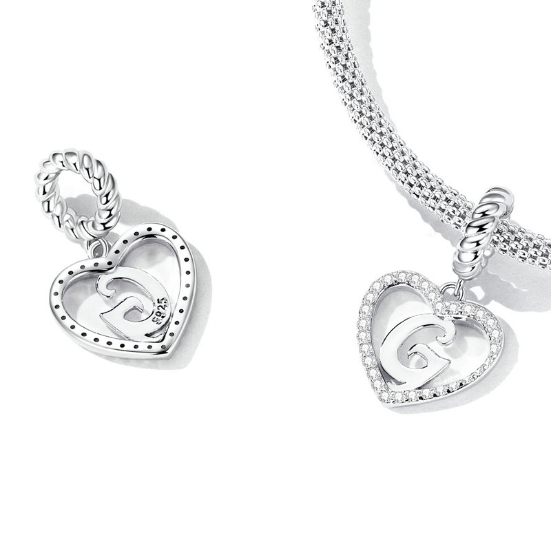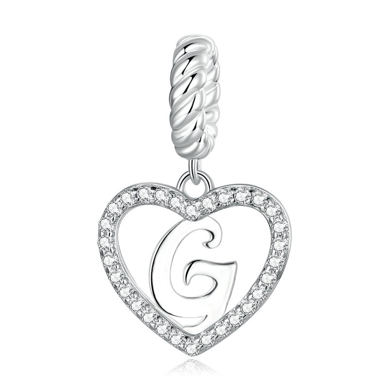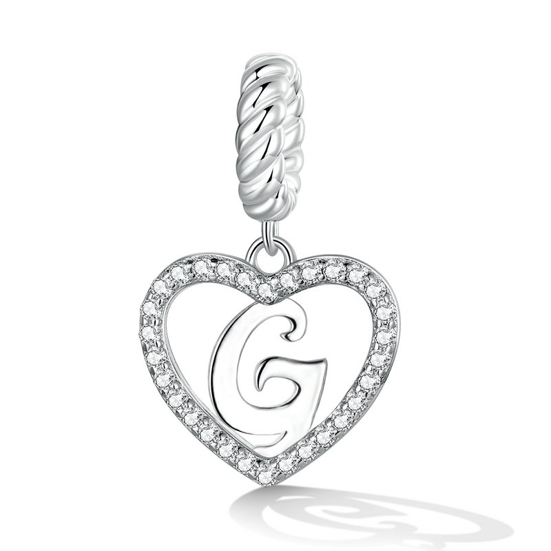 Pandantiv argint inima si litera G. Materiale: Argint 925, Zirconiu, Placat cu Rodiu. Culoare: Argintiu. Inaltime x Latime: 2,2 x 1,3 cm, Diametru orificiu: 0,45 cm, Greutate: 1,6 grame.