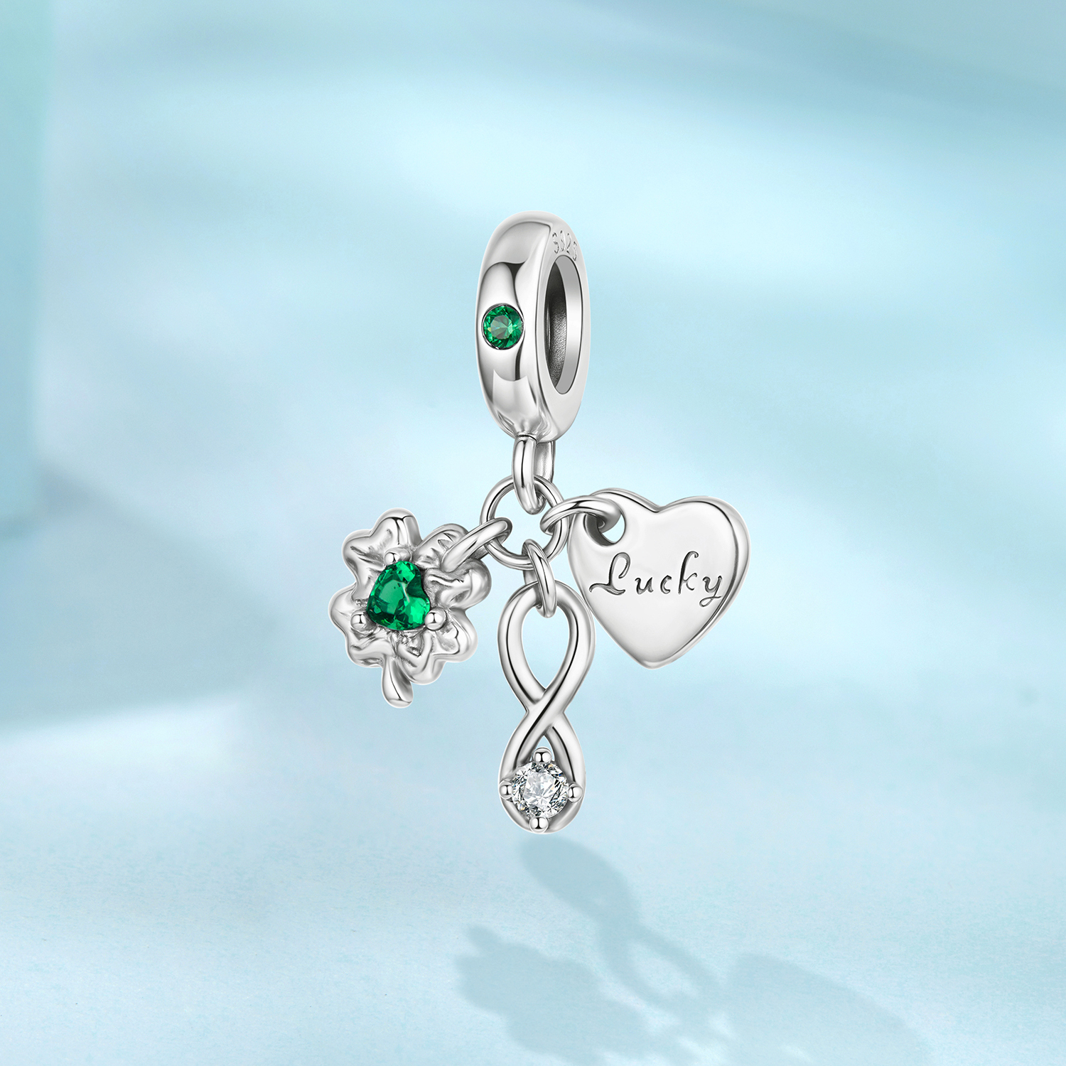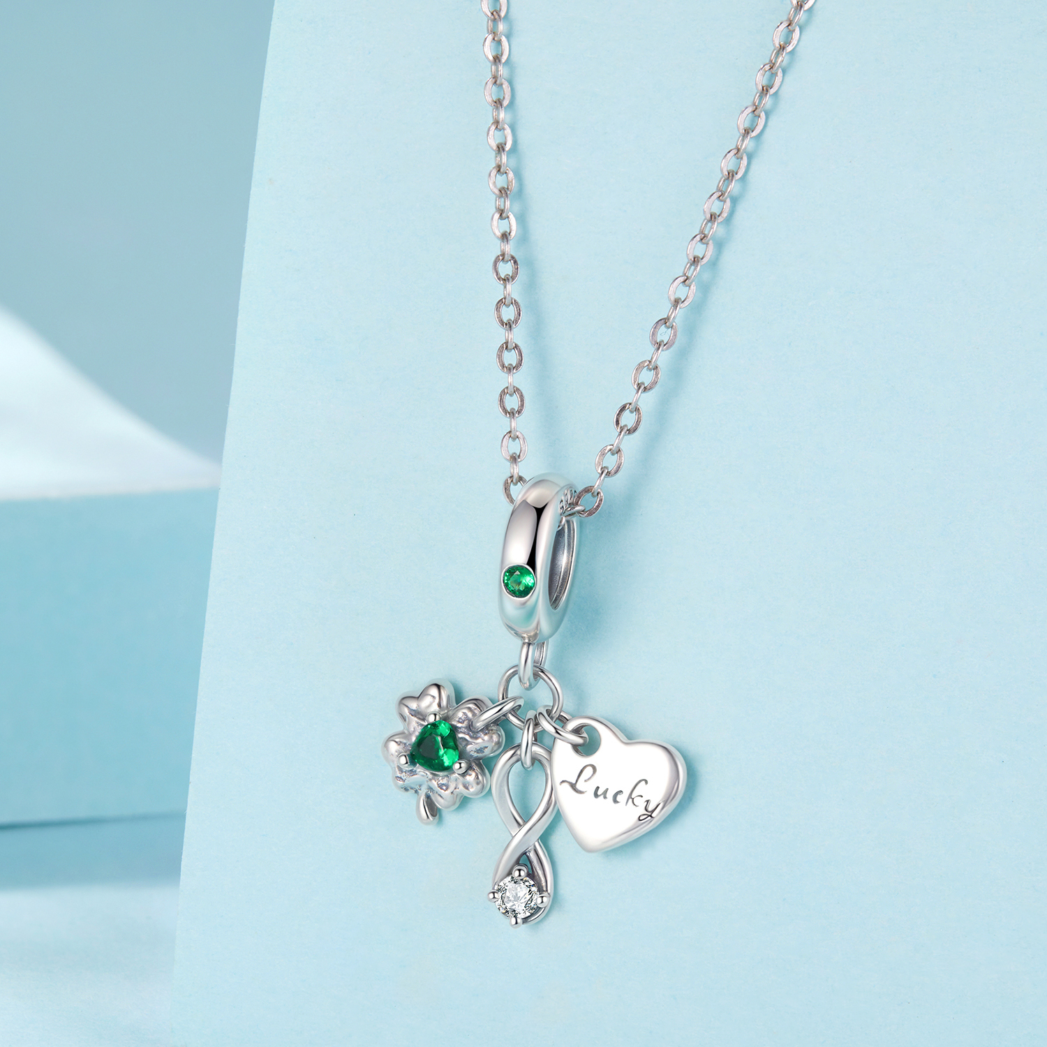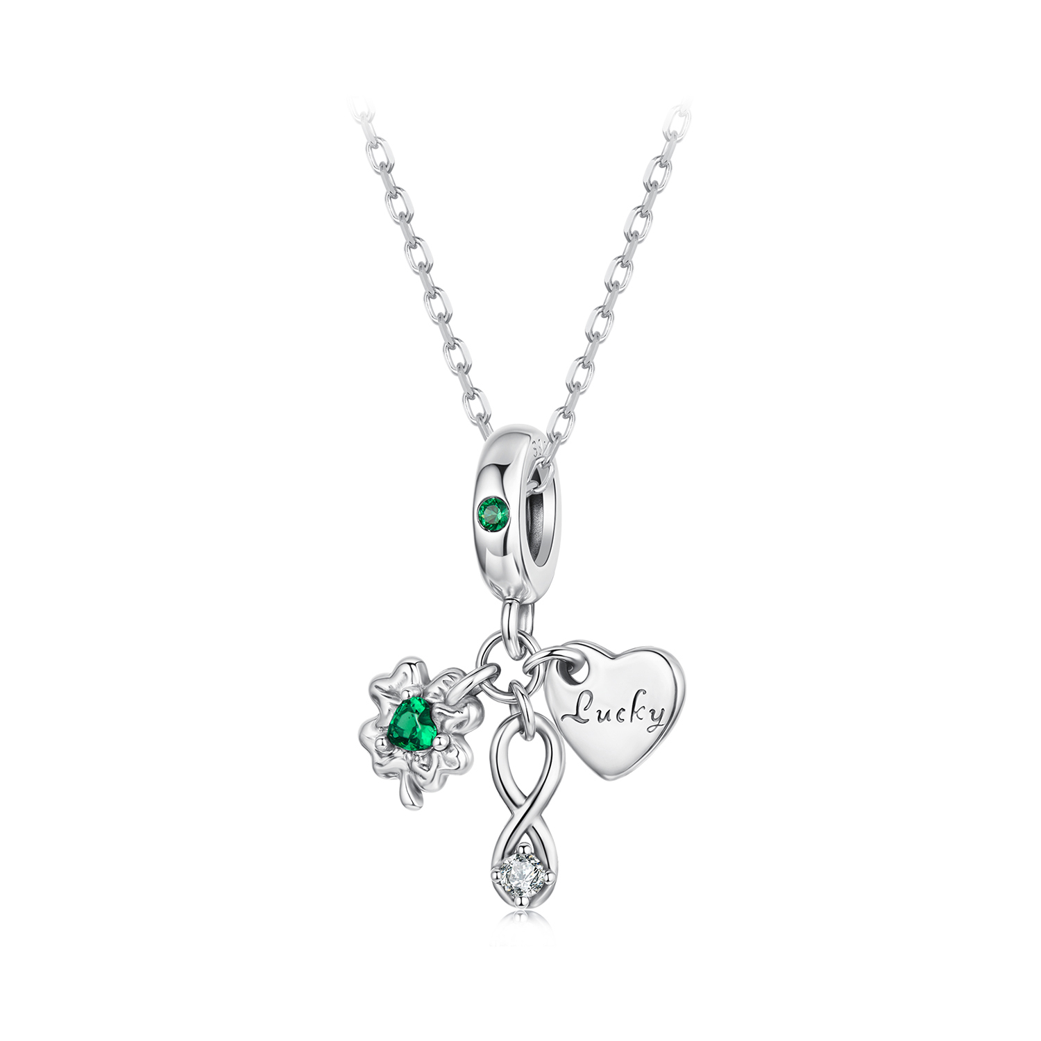Pandantiv argint Norocos cu Trifoi cu Patru Foi. Dimensiuni: 2,2 x 1,7 cm, Diametru orificiu: 0,45 cm, Greutate: 1,5 grame. Materiale: Argint 925, Zirconia. Pietre: Zirconia. Culoare: Verde.