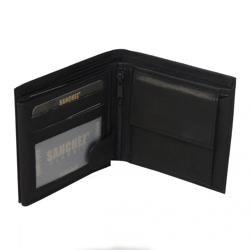 Portofel barbati din piele naturala Sanchez PORMZ013 Negru. Acest portofel din piele naturala este un accesoriu sigur si usor de folosit, cu multiple compartimente interioare pentru bancnote, acte si monede. Ideal pentru cadou. Dimensiuni: 12 x 9,5 x 2 cm