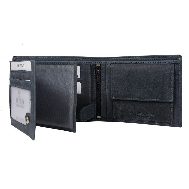 Portofel barbati din piele naturala Wild PORM595 Albastru. Acest portofel din piele naturala este un accesoriu sigur si usor de folosit, cu multiple compartimente interioare pentru bancnote, acte si monede. Ideal pentru cadou (portofelul este ambalat in cutie de carton originala branduita cu marca producatorului).