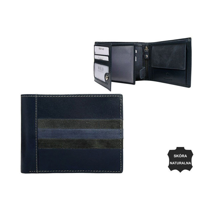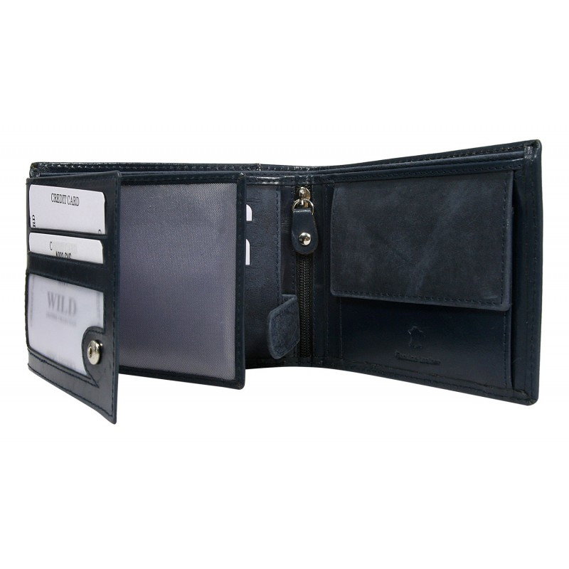Portofel barbati din piele naturala Wild PORM602 Albastru. Acest portofel din piele naturala este un accesoriu sigur si usor de folosit, cu multiple compartimente interioare pentru bancnote, acte si monede. Ideal pentru cadou.