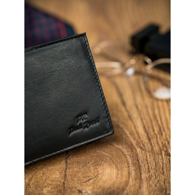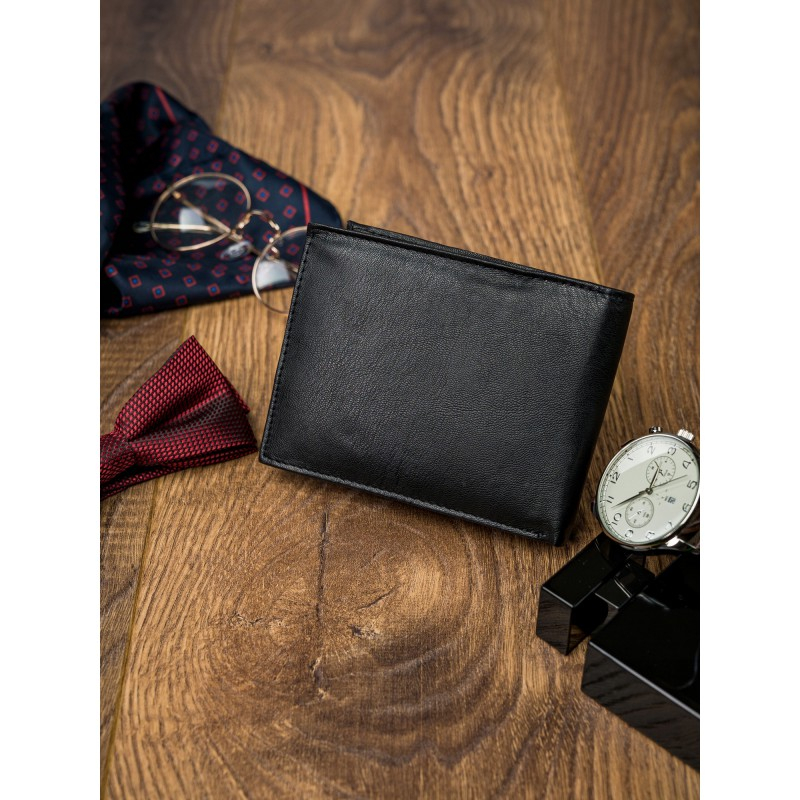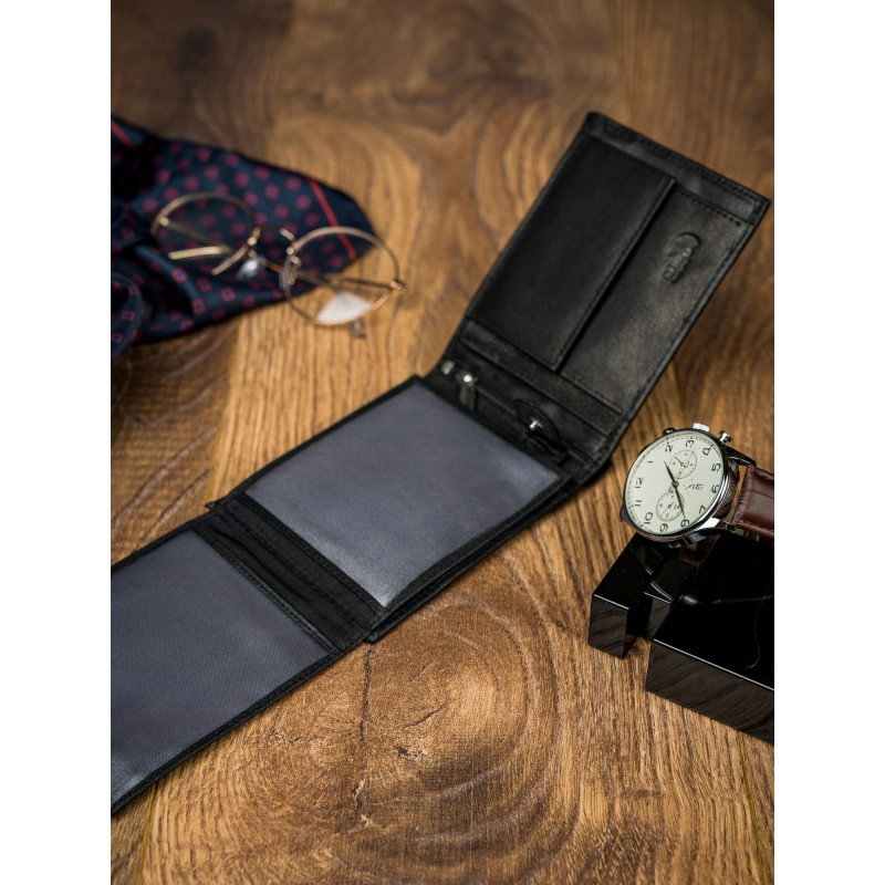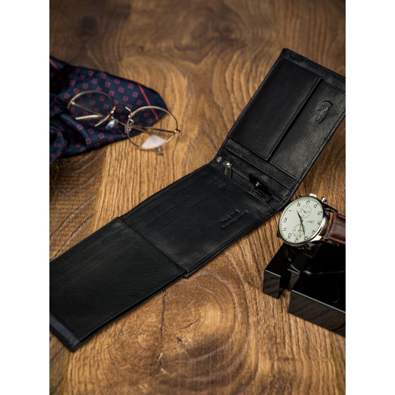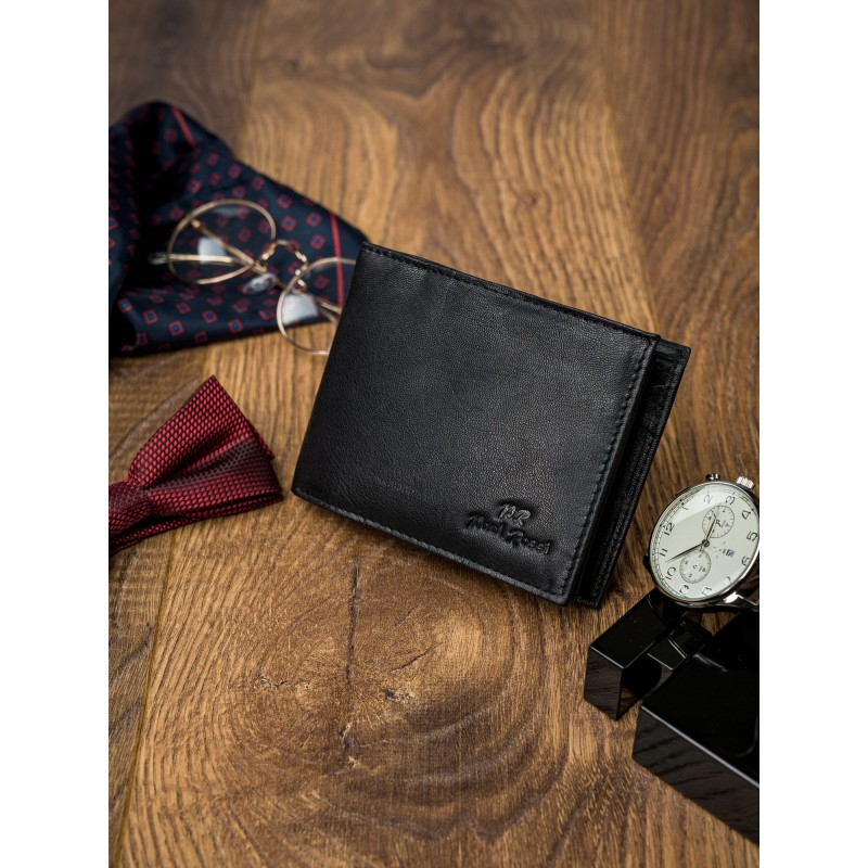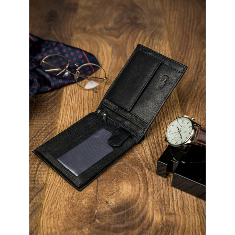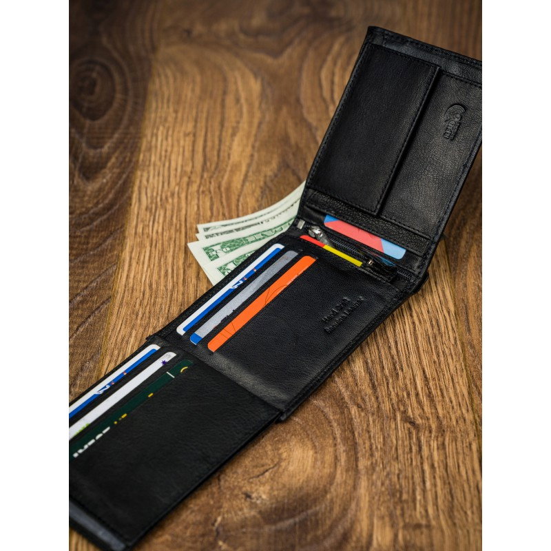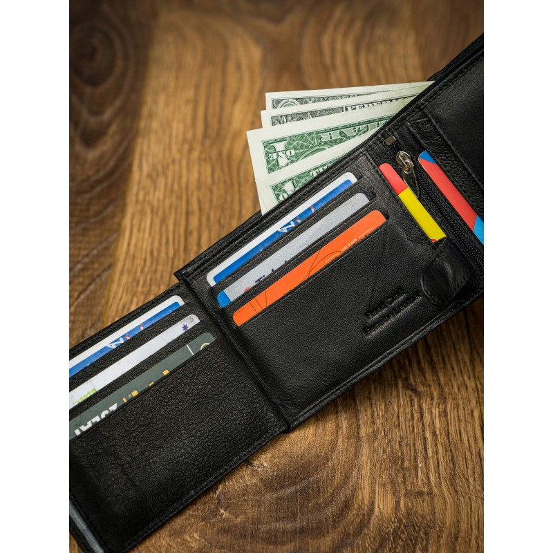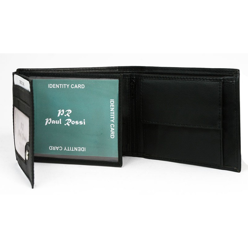 Portofel barbati din piele naturala PORMG022 negru, Paul Rossi, cu protectie RFID. Acest portofel din piele naturala este un accesoriu sigur si usor de folosit, cu multiple compartimente interioare pentru bancnote, acte si monede. Ideal pentru cadou (produs ambalat in cutia branduita a producatorului). Dimensiuni: 12,5 x 9,5 x 2,5 cm