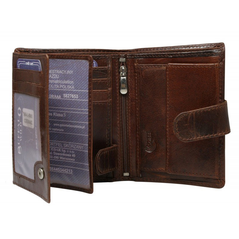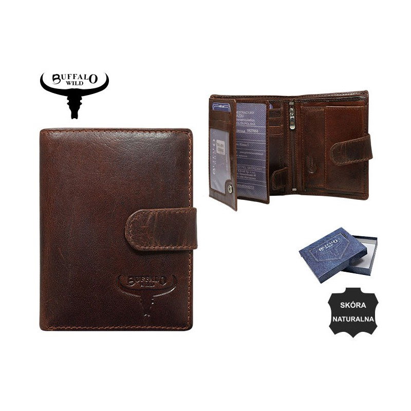 Portofel barbati vertical din piele naturala Wild Buffalo PORMG041 Maron Coniac, cu protectie RFID . Acest portofel din piele naturala este un accesoriu sigur si usor de folosit, cu multiple compartimente interioare pentru bancnote, acte si monede. Ideal pentru cadou (produs ambalat in cutia originala a producatorului). Dimensiuni: 12,8 x 10,5 x 2 cm