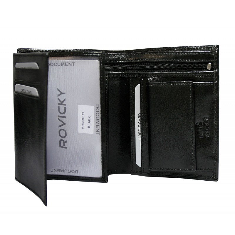 Portofel vertical barbati premium piele naturala de cea mai buna calitate Rovicky PORMG053, cu RFID, Negru. Acest portofel din piele naturala este un accesoriu incapator, cu diverse compartimente, sigur si usor de folosit, ideal pentru cadou. Din piele de cea mai buna calitate si cu dimensiuni si compartimentare optime. Dimensiuni:12,5 x 10 x 2,5 cm. Ambalaj: cutie carton