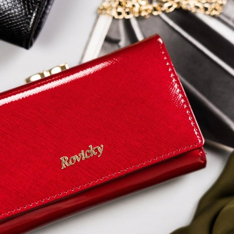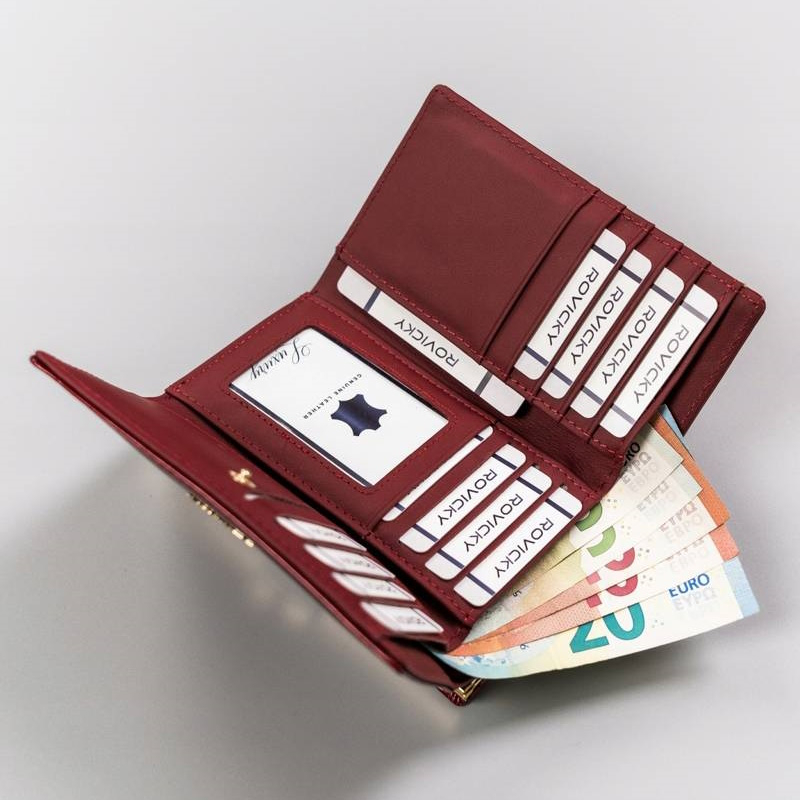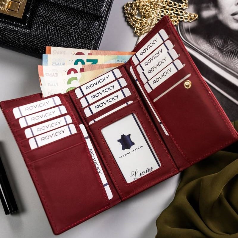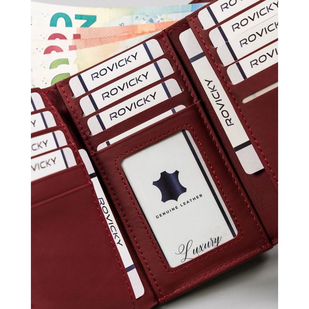 Portofel dama din piele naturala Rovicky PORTG510, Rosu, cu protectie carduri RFID. Acest portofel din piele naturala este un accesoriu sigur si usor de folosit, cu multiple compartimente interioare pentru carduri, bancnote, acte si monede. Ideal pentru cadou (portofelul este ambalat in cutie de carton originala branduita cu marca producatorului). Dimensiuni: 14 x 8,5 x 3 cm.