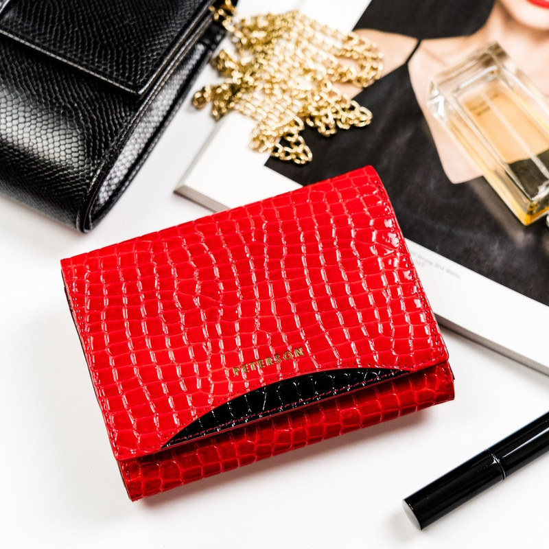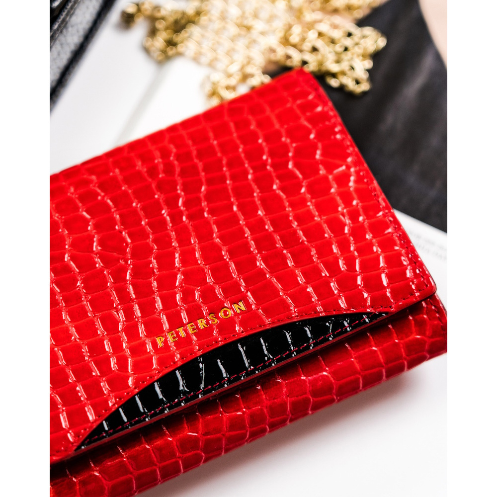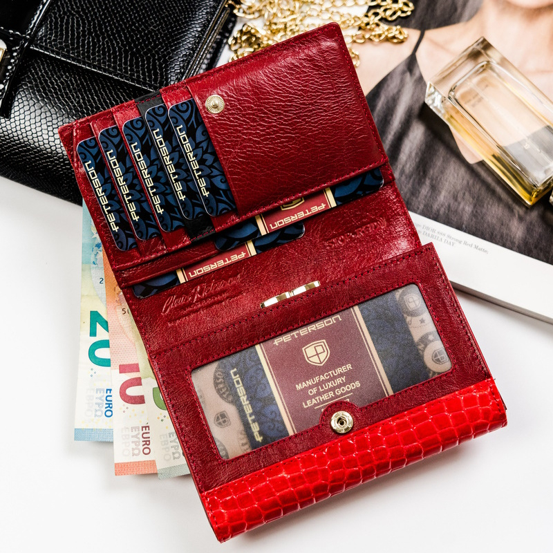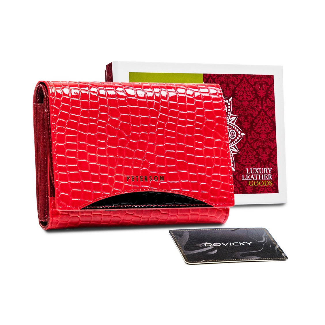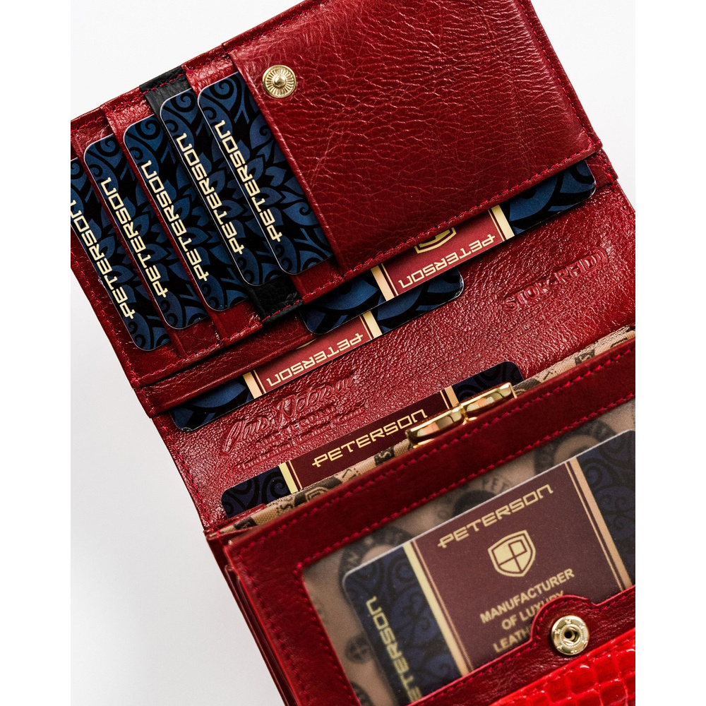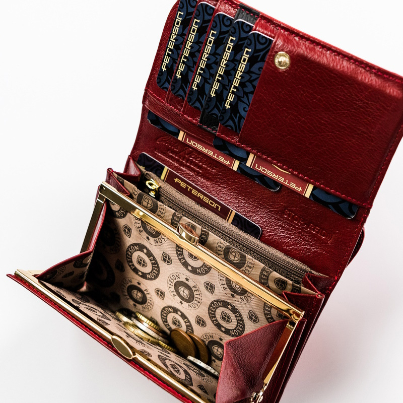 Portofel dama din piele naturala Peterson PORTG515, Rosu, cu protectie carduri RFID. Acest portofel din piele naturala este un accesoriu sigur si usor de folosit, cu multiple compartimente interioare pentru carduri, bancnote, acte si monede. Ideal pentru cadou (portofelul este ambalat in cutie de carton originala branduita cu marca producatorului). Dimensiuni: 14,5 x 11,5 x 3 cm.