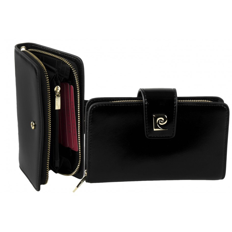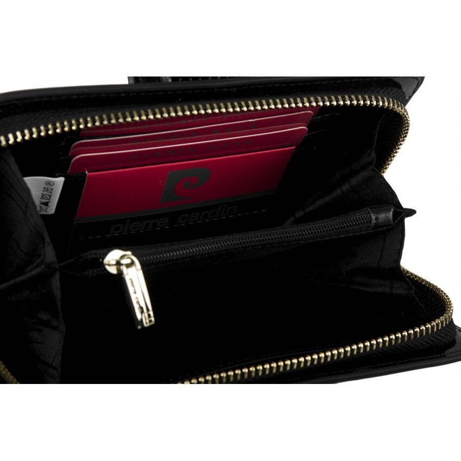 Portofel elegant pentru femei Tip piele: lacuita Marcă: Pierre Cardin Închidere exterioară cu capsa Închidere internă cu fermoar 6 sloturi pentru card de credit Dimensiuni: 18 * 11 * 3 cm - Livrat in cutie originala branduita cu marca producatorului (ideal pentru cadou)