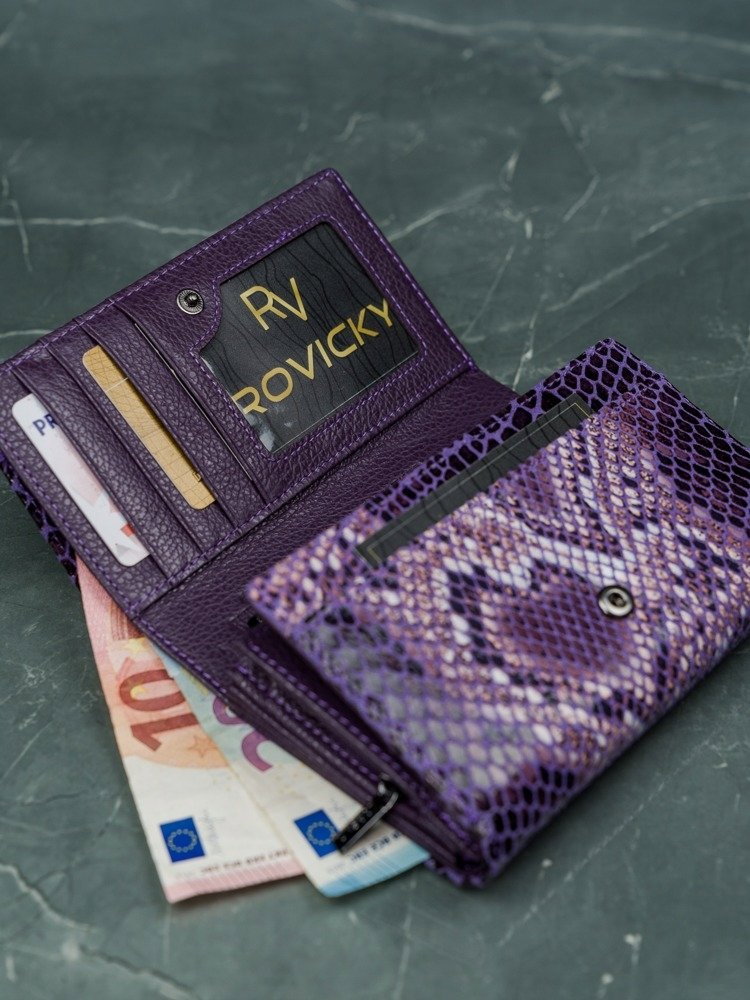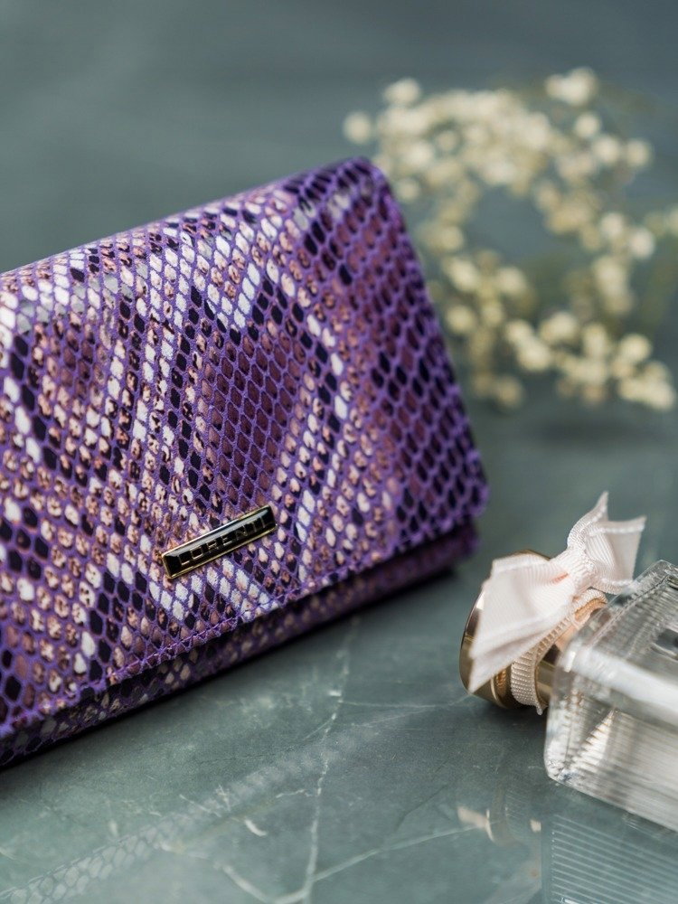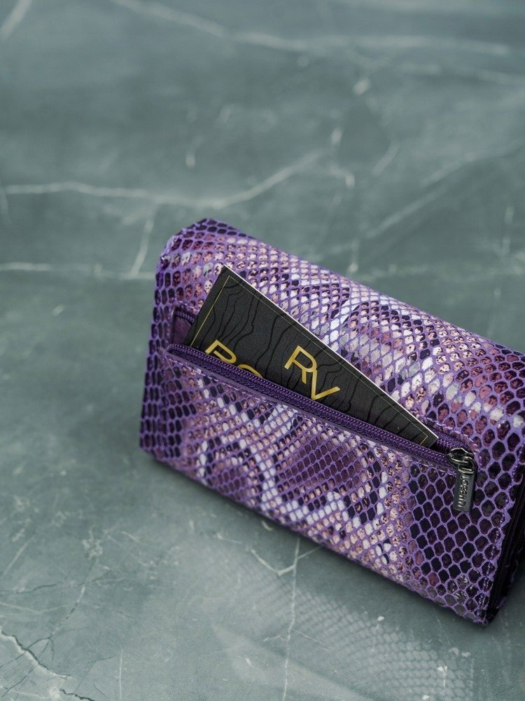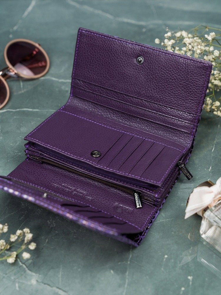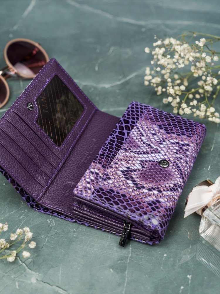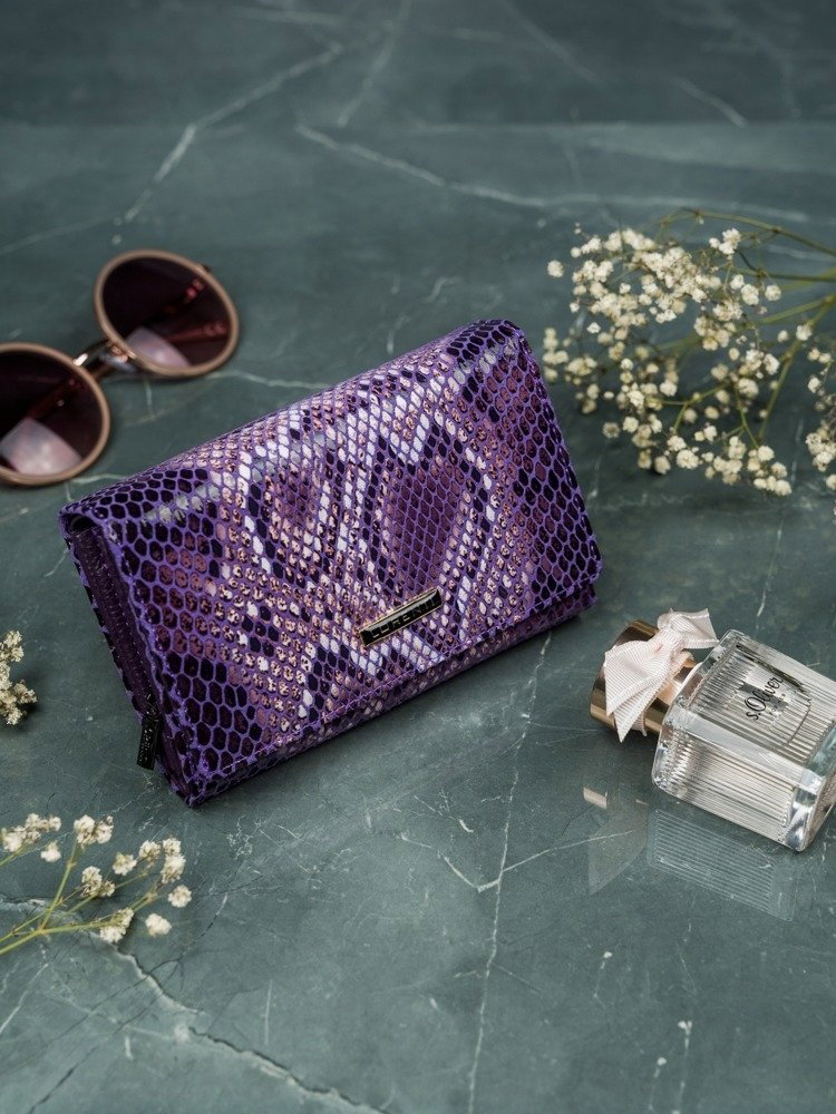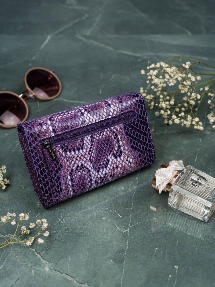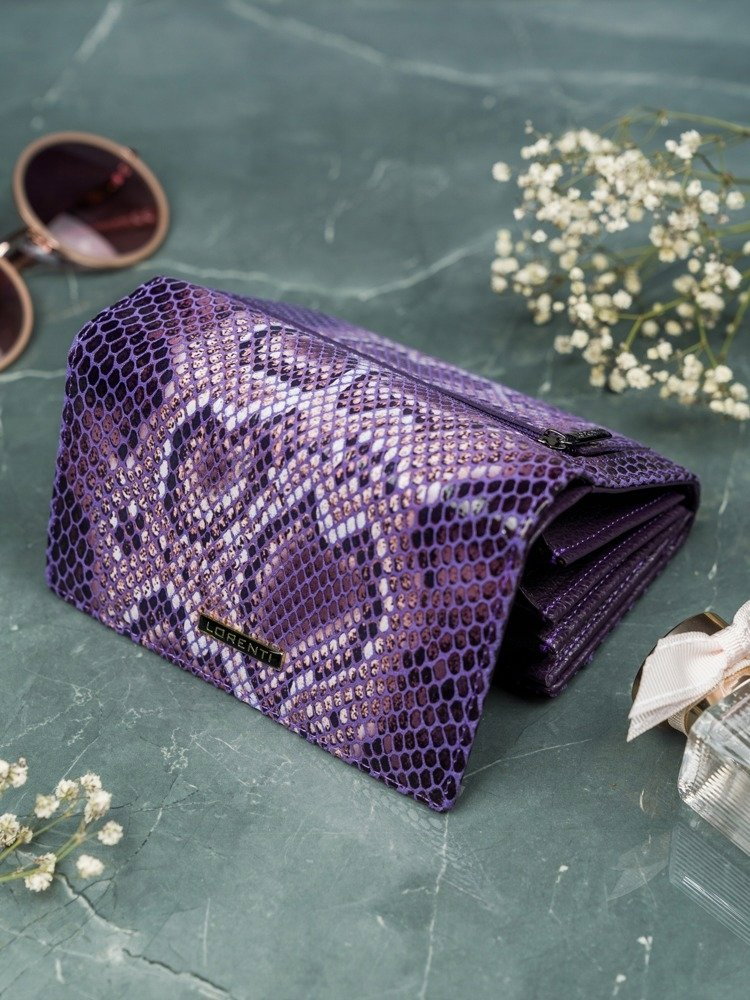 Portofel de lux pt. dama Lorenti PORTG009 din piele naturala lacuita, model sarpe, Lila. Acest portofel din piele naturala este un accesoriu sigur si usor de folosit, cu multiple compartimente interioare pentru bancnote, acte si monede. Ideal pentru cadou (portofelul este ambalat in cutie de carton originala branduita cu marca producatorului). Dimensiuni: 15 x 10 x 3,5 cm