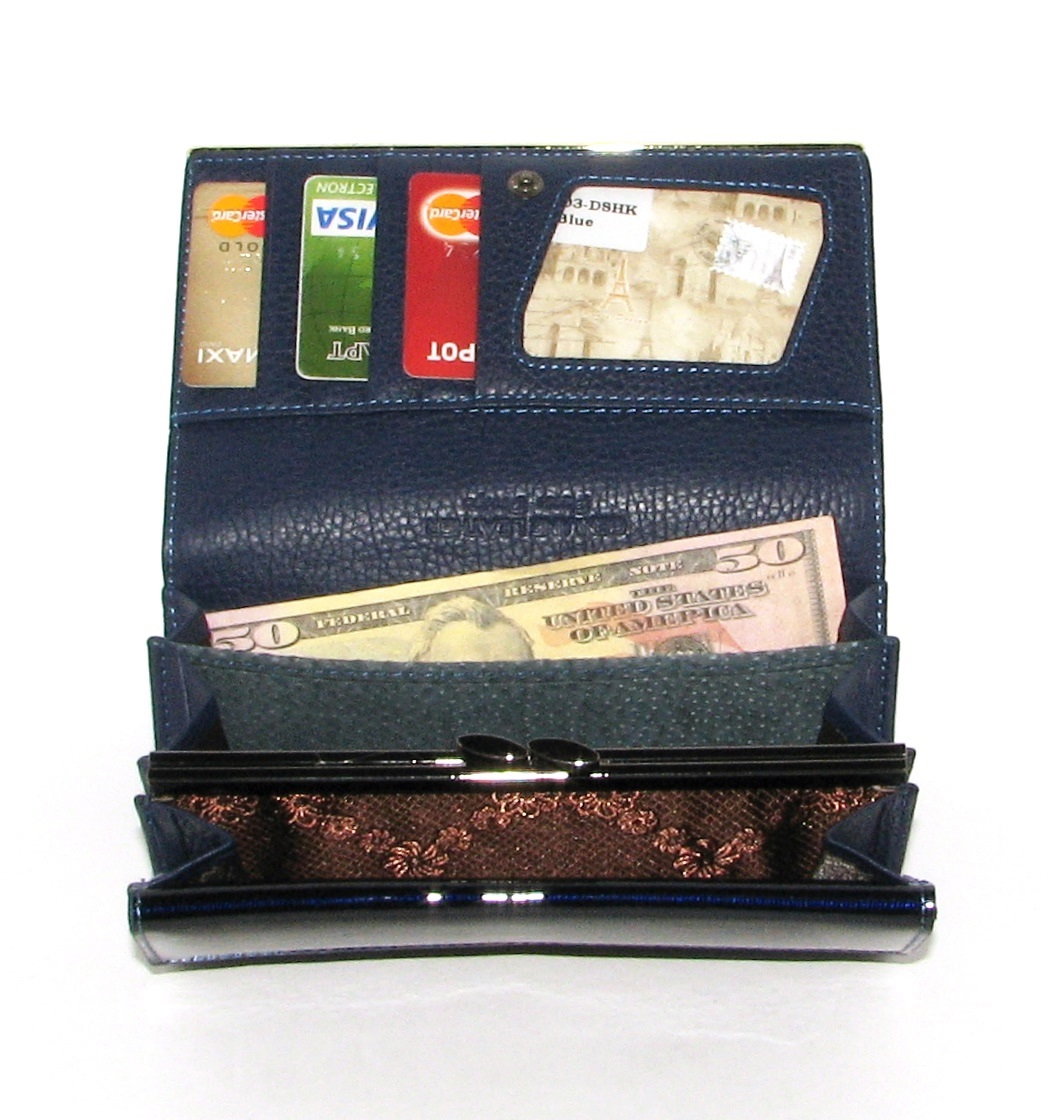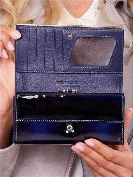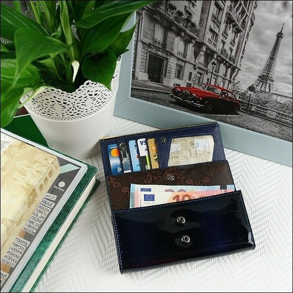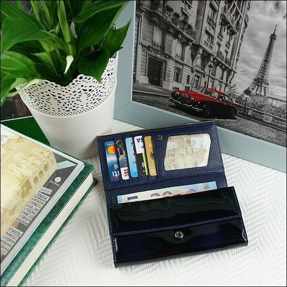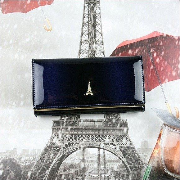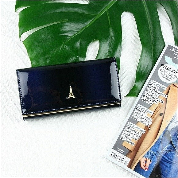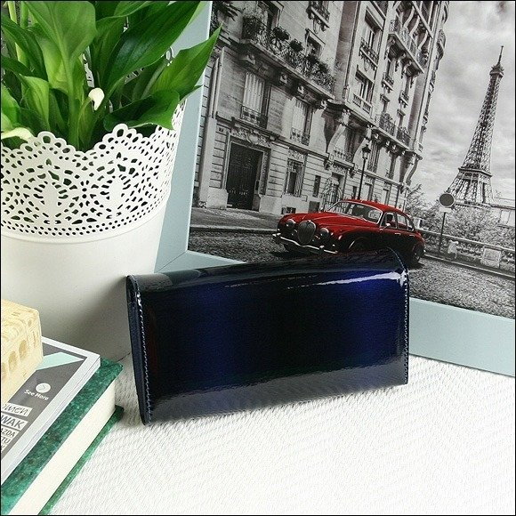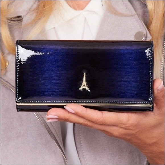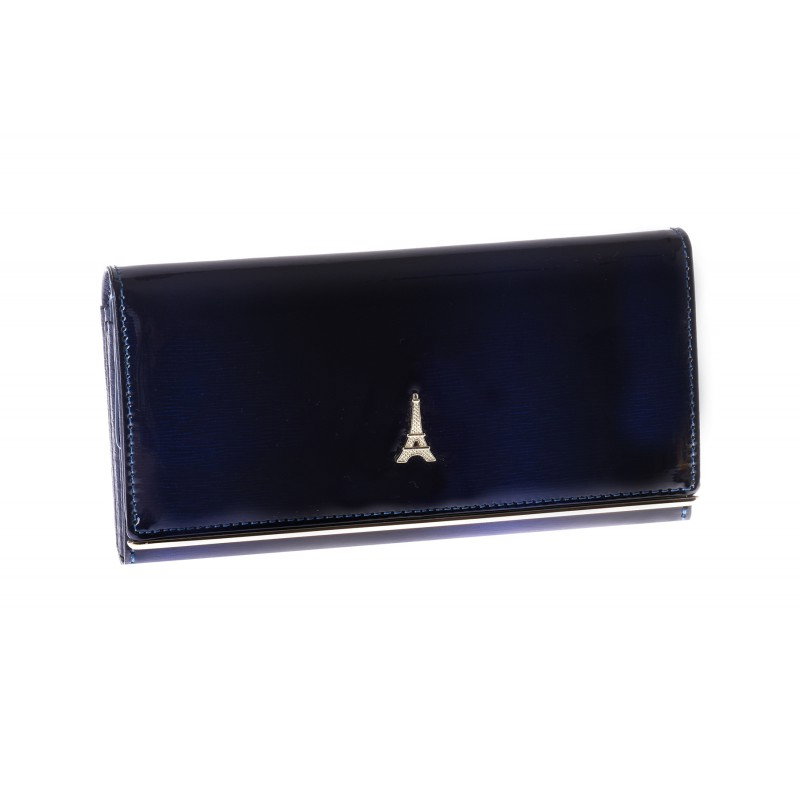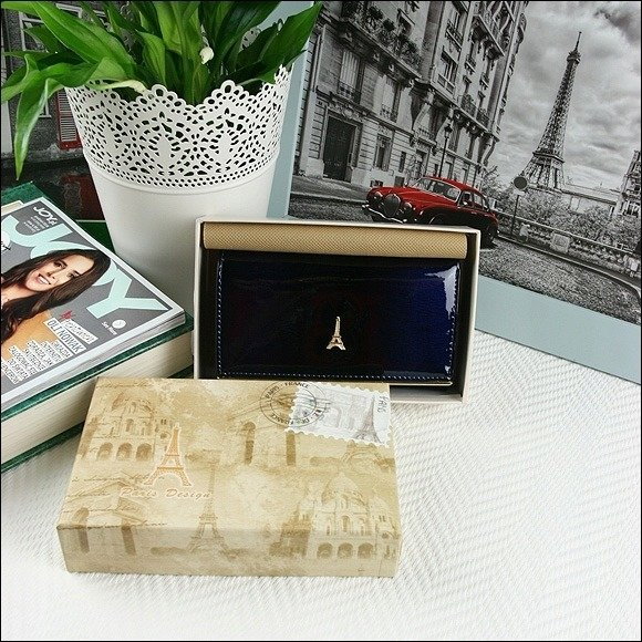 Portofel de lux pt. dama Paris PORTG006, Albastru, din piele naturala lacuita. Acest portofel deosebit de elegant din piele naturala este un accesoriu sigur si usor de folosit, cu multiple compartimente interioare pentru bancnote, acte si monede. Ideal pentru cadou (portofelul este ambalat in cutie de carton originala branduita cu marca producatorului). Dimensiuni: 16,5 x 9 x 3,5 cm