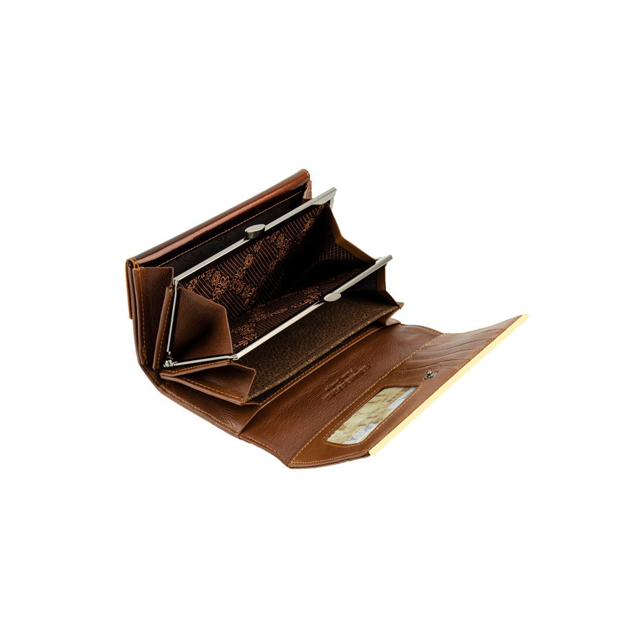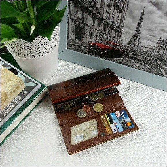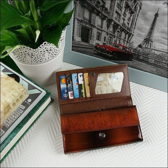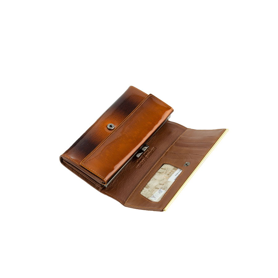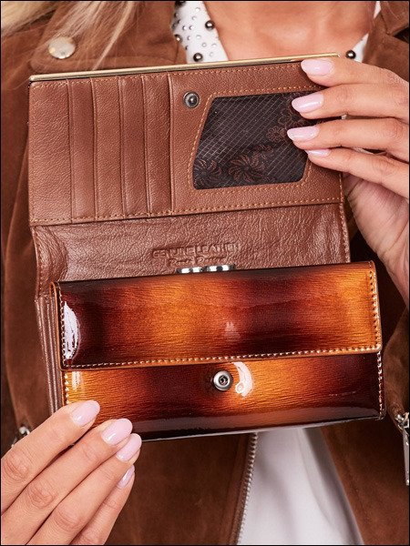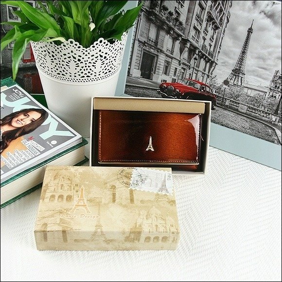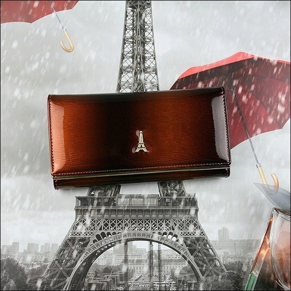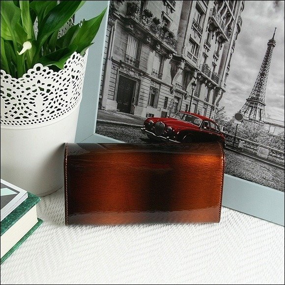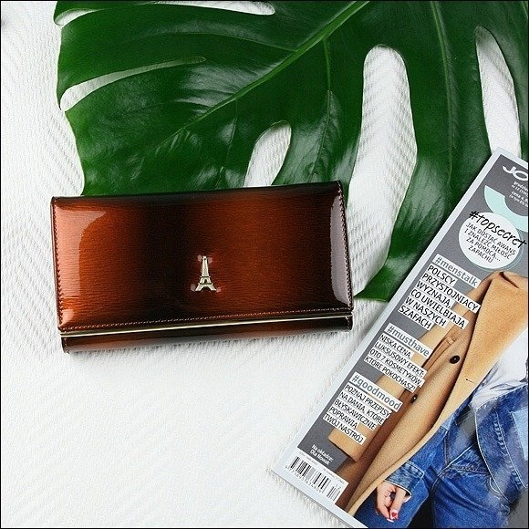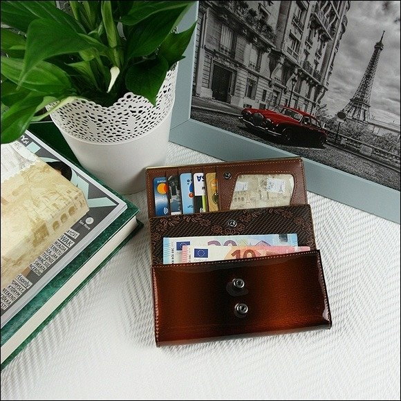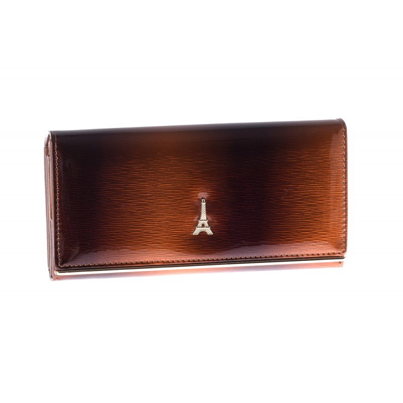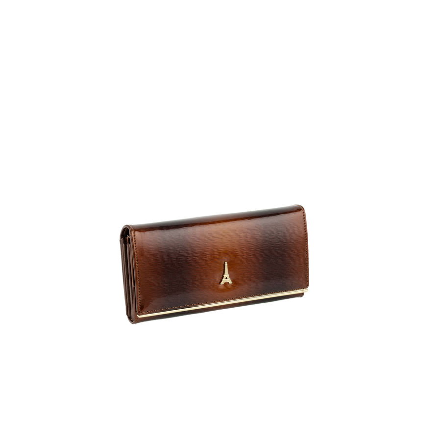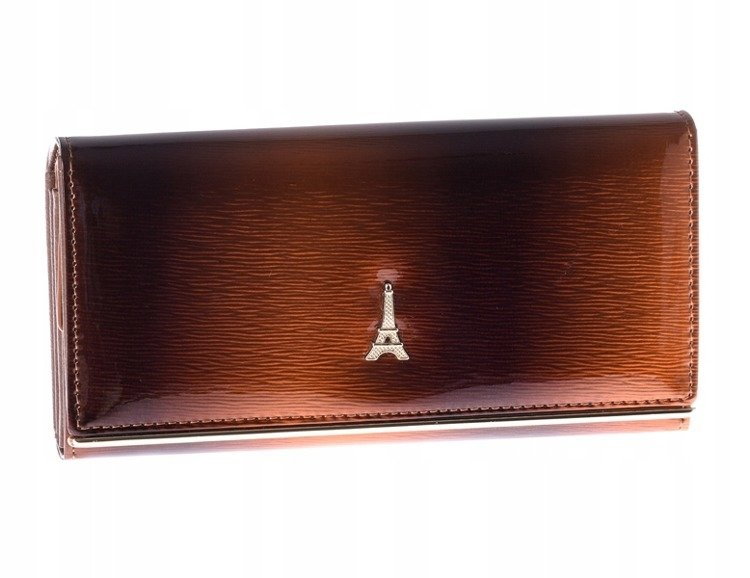 Portofel de lux pt. dama Paris PORTG007, Maron, din piele naturala lacuita. Acest portofel deosebit de elegant din piele naturala este un accesoriu sigur si usor de folosit, cu multiple compartimente interioare pentru bancnote, acte si monede. Ideal pentru cadou (portofelul este ambalat in cutie de carton originala branduita cu marca producatorului). Dimensiuni: 16,5 x 9 x 3,5 cm