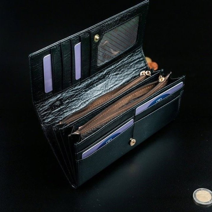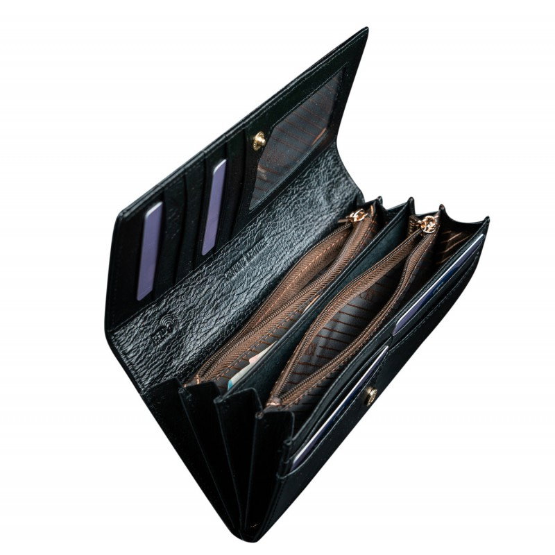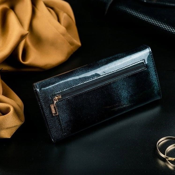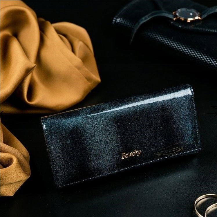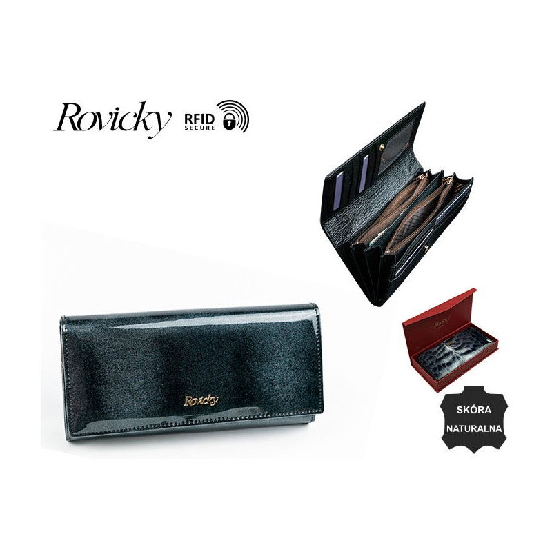 Portofel de lux pt. dama Rovicky PORTG004 Negru din piele naturala lacuita cu protectie RFID. Acest portofel din piele naturala este un accesoriu sigur si usor de folosit, cu multiple compartimente interioare pentru bancnote, acte si monede. Ideal pentru cadou (portofelul este ambalat in cutie de carton originala branduita cu marca producatorului). Dimensiuni: 18,5 x 9,5 x 3,5 cm