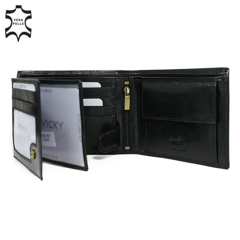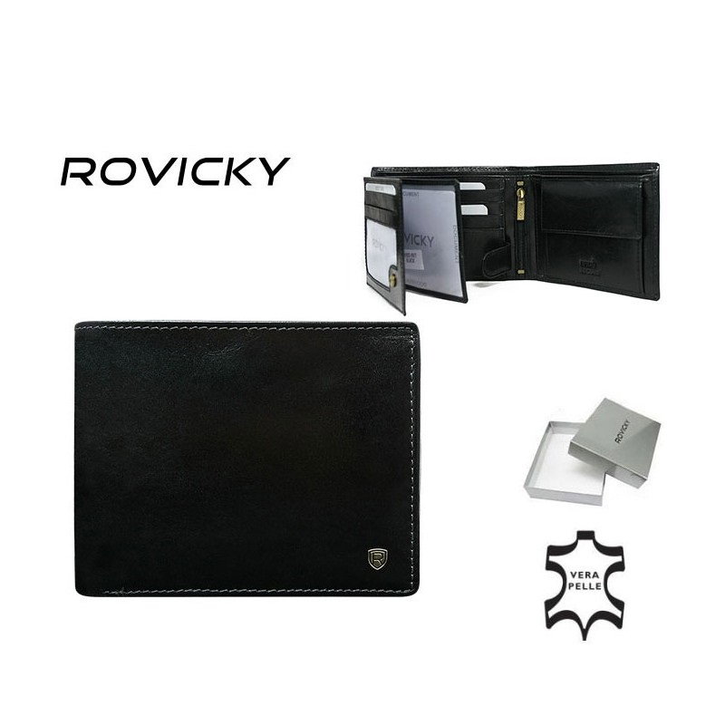 Portofel din piele naturala pt. barbati Rovicky PORM301 Negru. Acest portofel din piele naturala este un accesoriu sigur si usor de folosit, cu multiple compartimente interioare pentru bancnote, acte si monede. Ideal pentru cadou (portofelul este ambalat in cutie de carton originala branduita cu marca producatorului).